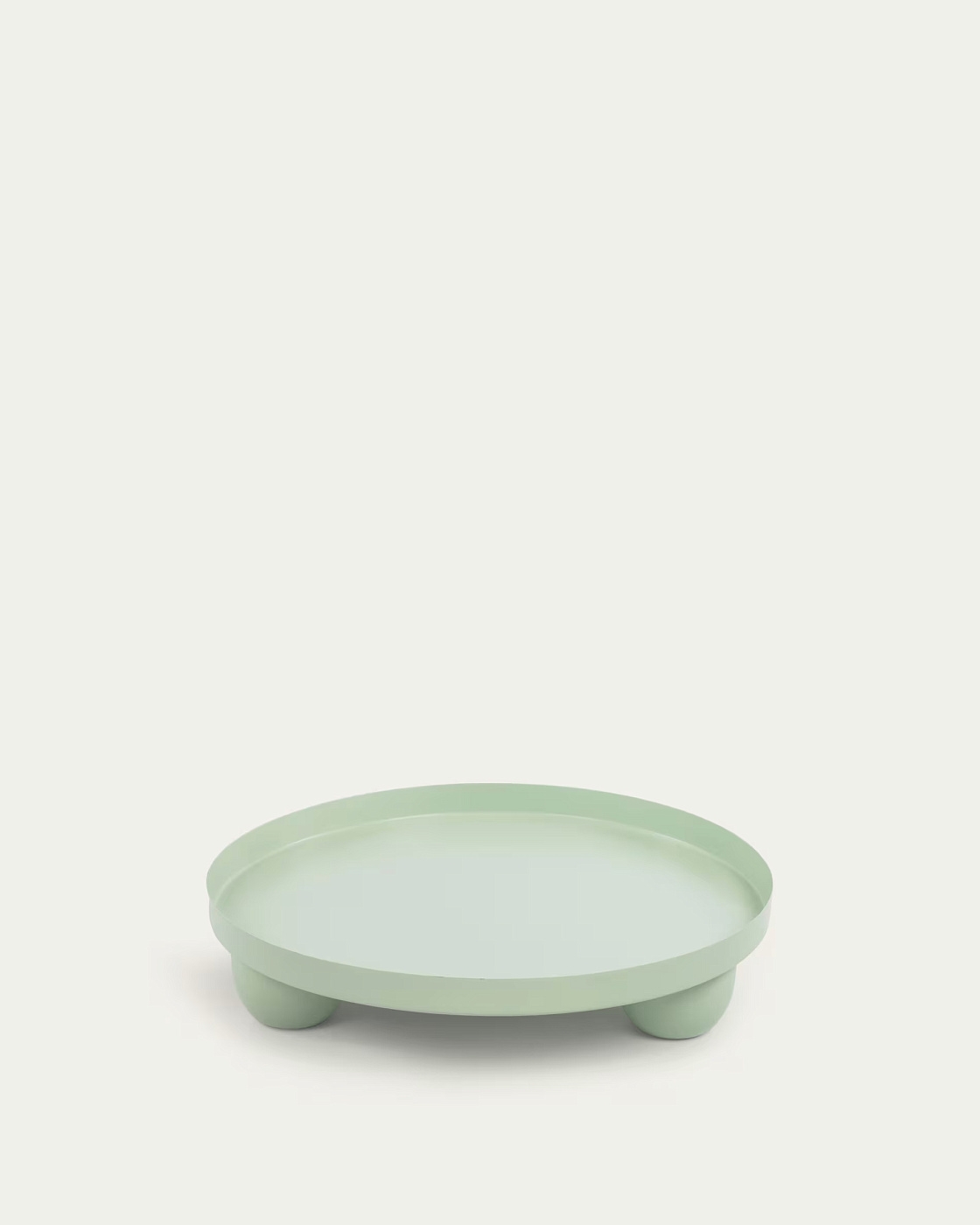 Поднос круглый. Он полностью сделан из металла и окрашен в светло-зеленый матовый цвет по технологии порошкового нанесения, что делает поверхность идеальной. Также эмаль защищает металл от влаги, ультрафиолета, перепадов температуры.