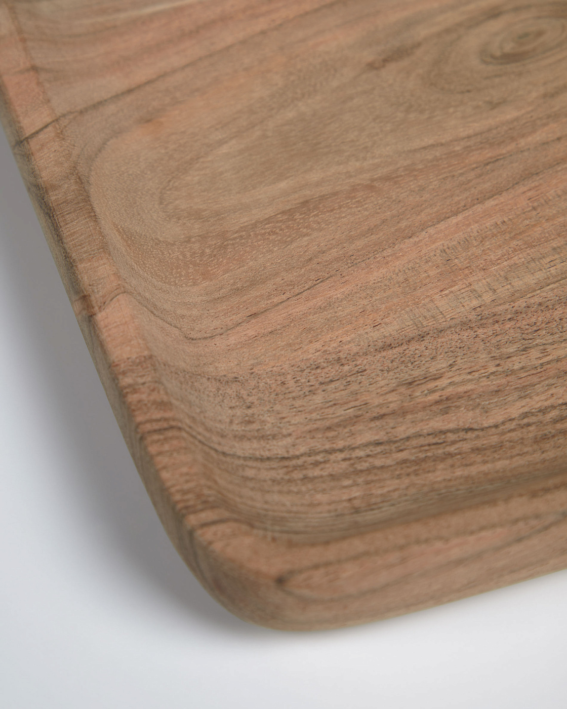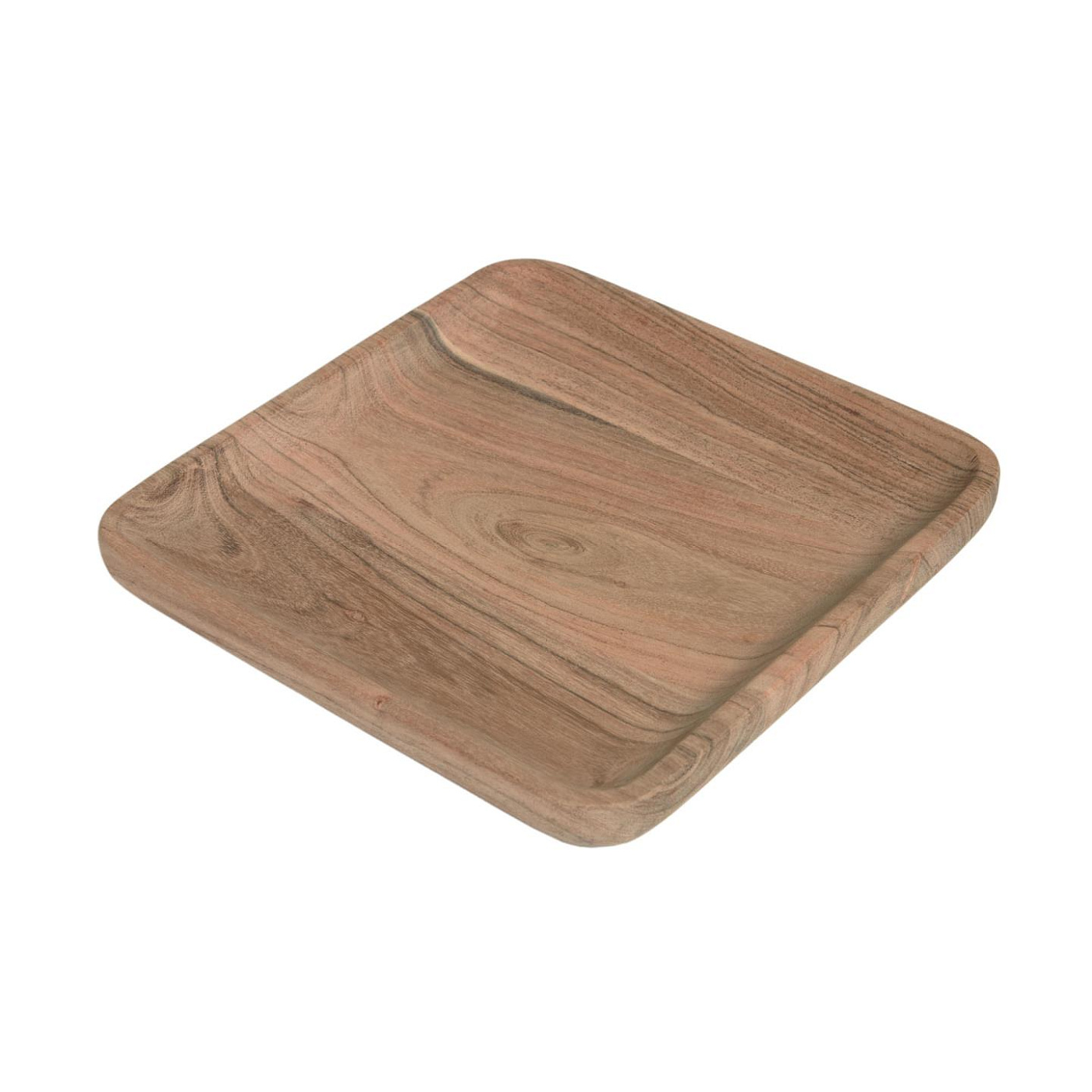 Поднос полностью сделан из массива акации в натуральной отделке. Он имеет квадратную форму с загнутыми вверх краями.