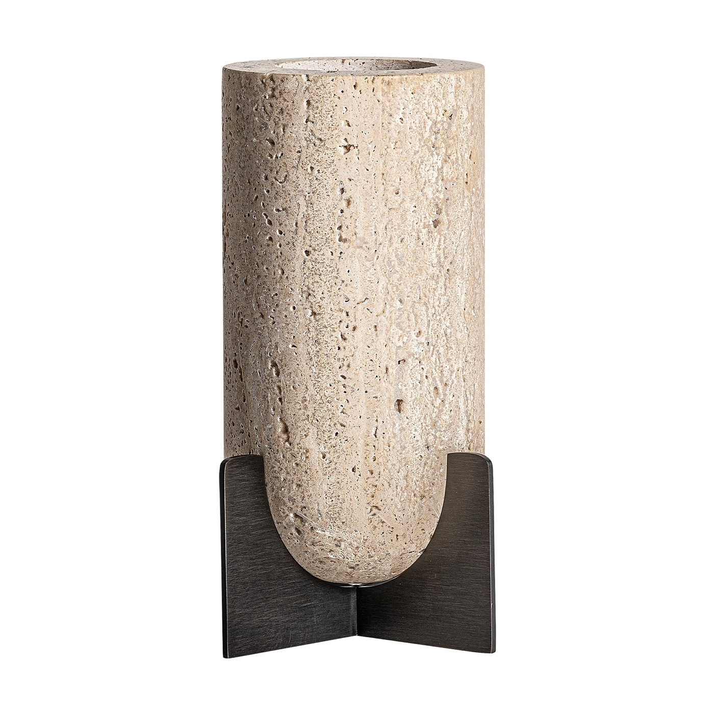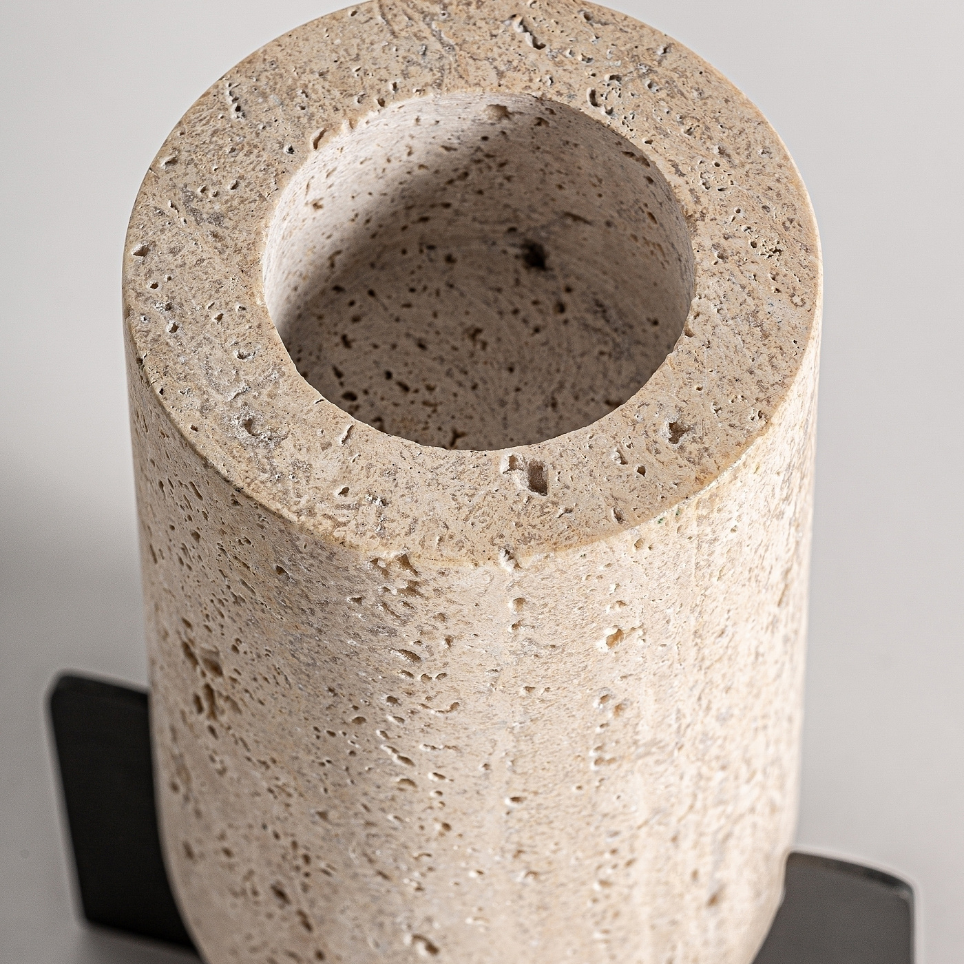 Подсвечник Asher, бежевого цвета, стиль арт-деко. Изготовлен из травертина в сочетании с железом. Съемное изделие. Декор изготовлен из натуральных материалов, поэтому каждый из них будет эксклюзивным, со своими уникальными оттенками и текстурами. Пористость и неоднородность материала не считаются браком.