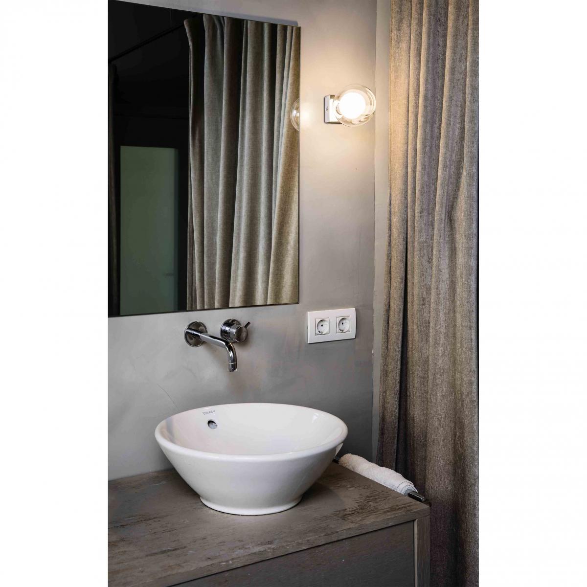 Настенный светильник для ванной от Alex & Manel Lluscà. PERLA - лампа круглой формы с прозрачным наружным рассеивателем, напоминающим пузырь. Этот хромированный настенный светильник идеально подходит для зеркального освещения .