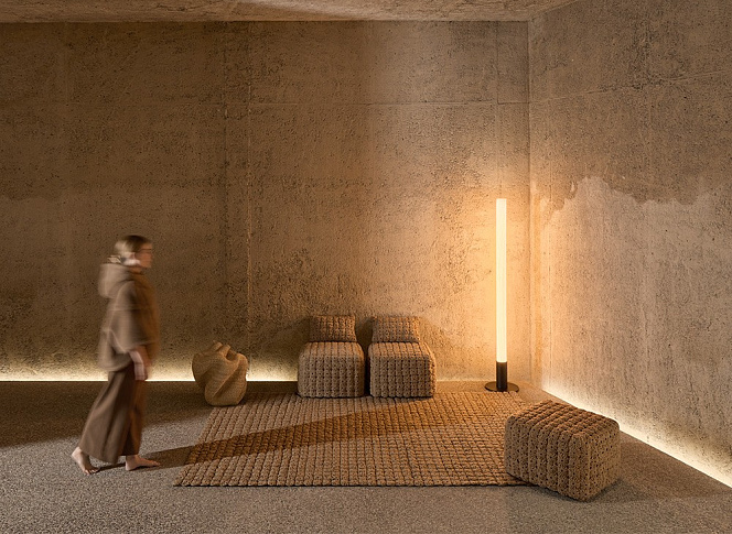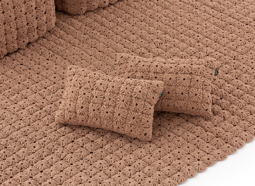 Подушка «Верблюжий» из коллекции Momos, дизайн со съемным чехлом от Хосе А. Гандиа-Бласко Каналеса, выполненная в нашей технике ручной вышивки, вдохновленной традиционными текстильными ремеслами северной Бразилии. Она сочетается с ковром и пуфом, создавая расслабленную и непринужденную атмосферу.