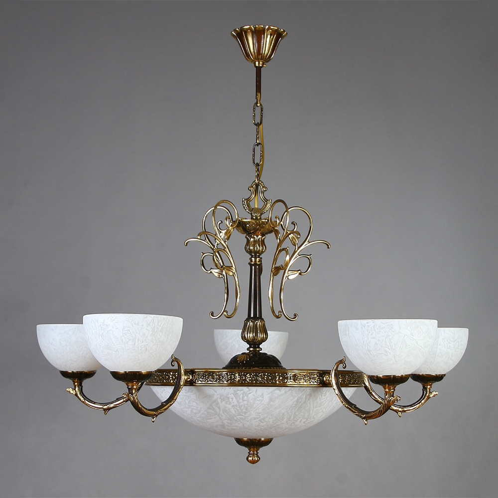 Люстра, выполненная из латуни в блестящей бронзовой отделке и абажурами из белого стекла.