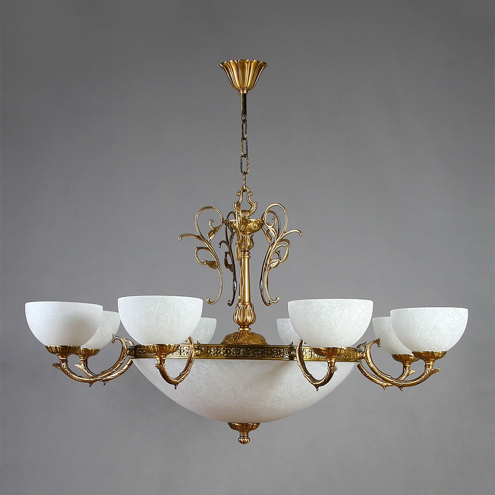 Люстра, выполненная из латуни в матовой бронзовой отделке и абажурами из белого стекла.