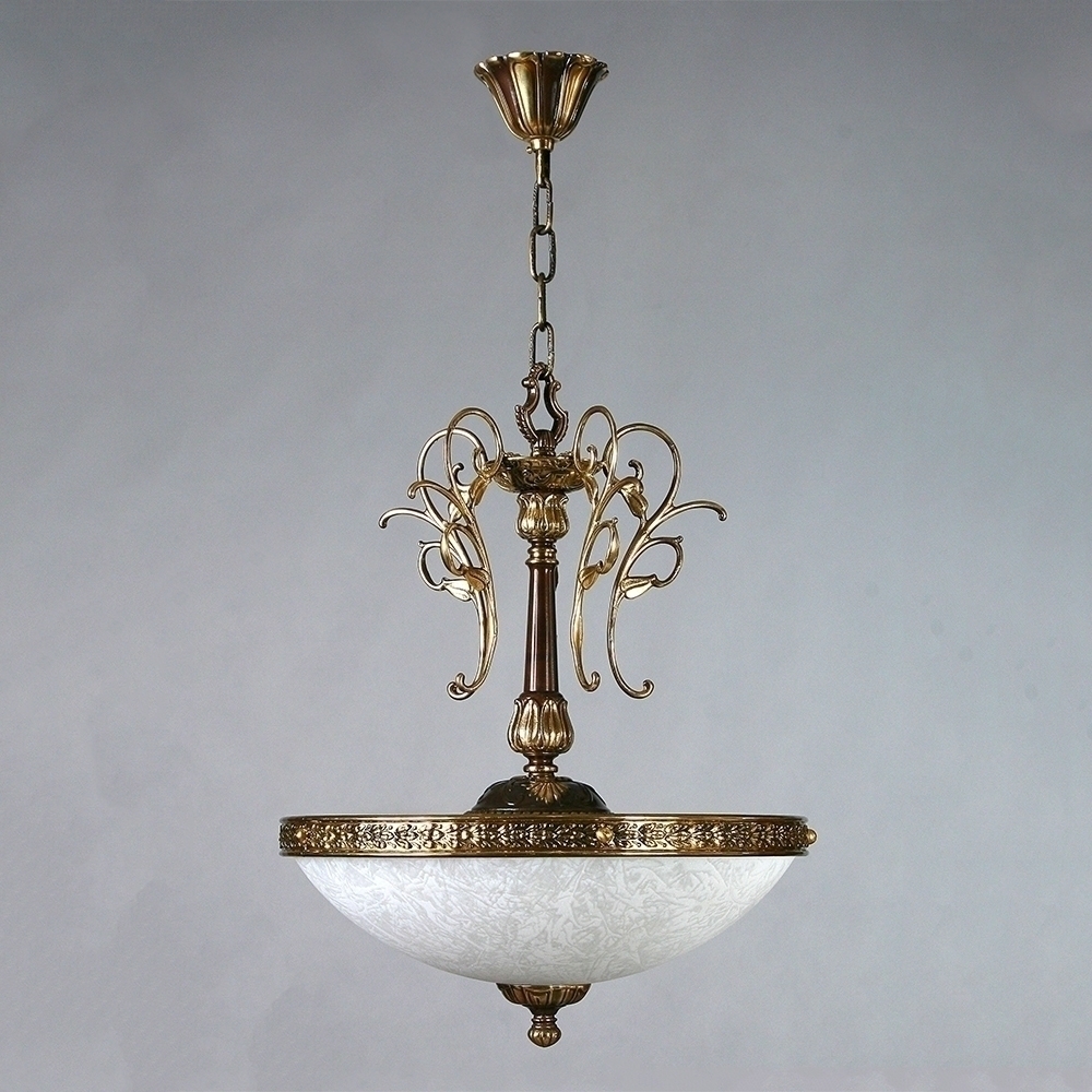 Люстра, выполненная из латуни в блестящей бронзовой отделке и абажуром из белого стекла.
