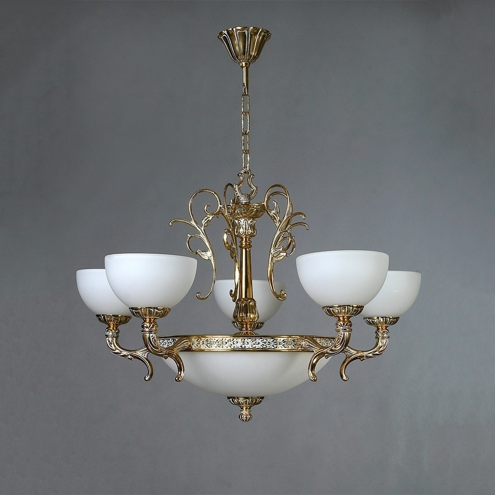 Люстра, выполненная из латуни в отделке "белая патина" с плафонами из стекла.