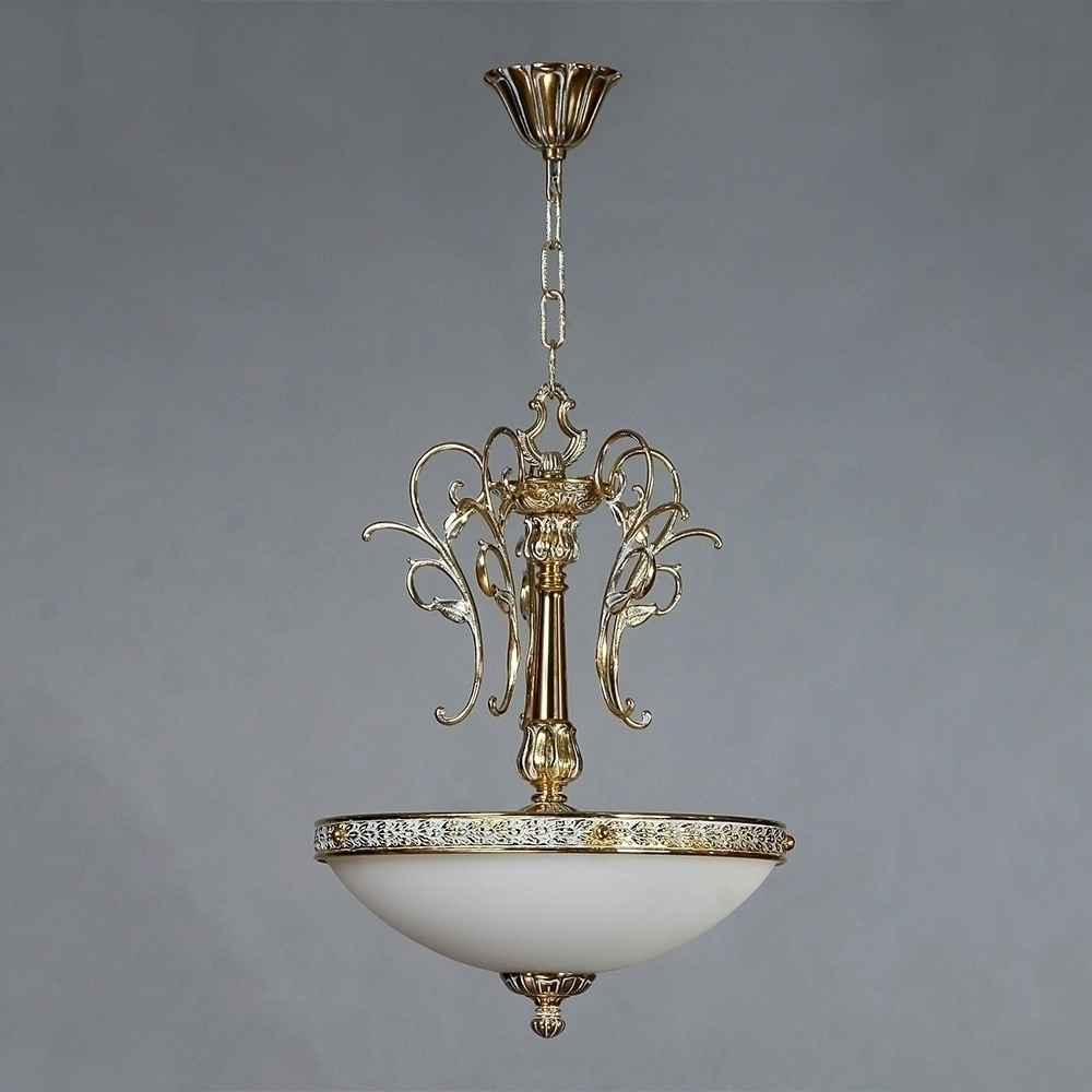 Люстра, выполненная из латуни в отделке "белая патина" с плафоном из стекла белого цвета.
