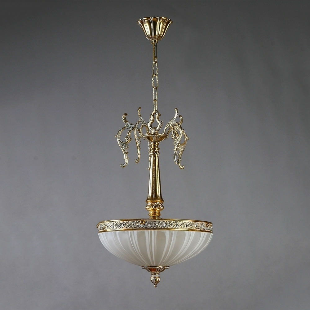 Люстра, выполненная из латуни в отделке "белая патина" с плафоном из стекла белого цвета.