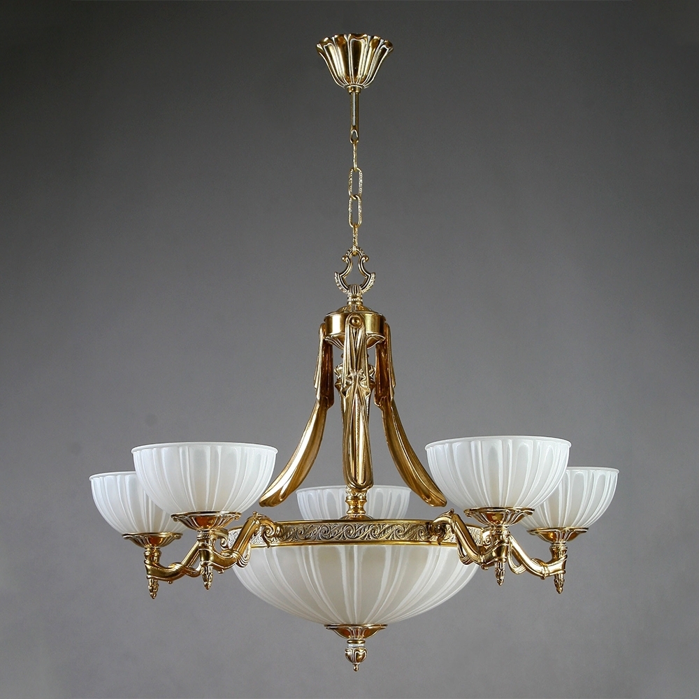 Люстра, выполненная из латуни в отделке "белая патина" с плафонами из стекла белого цвета.