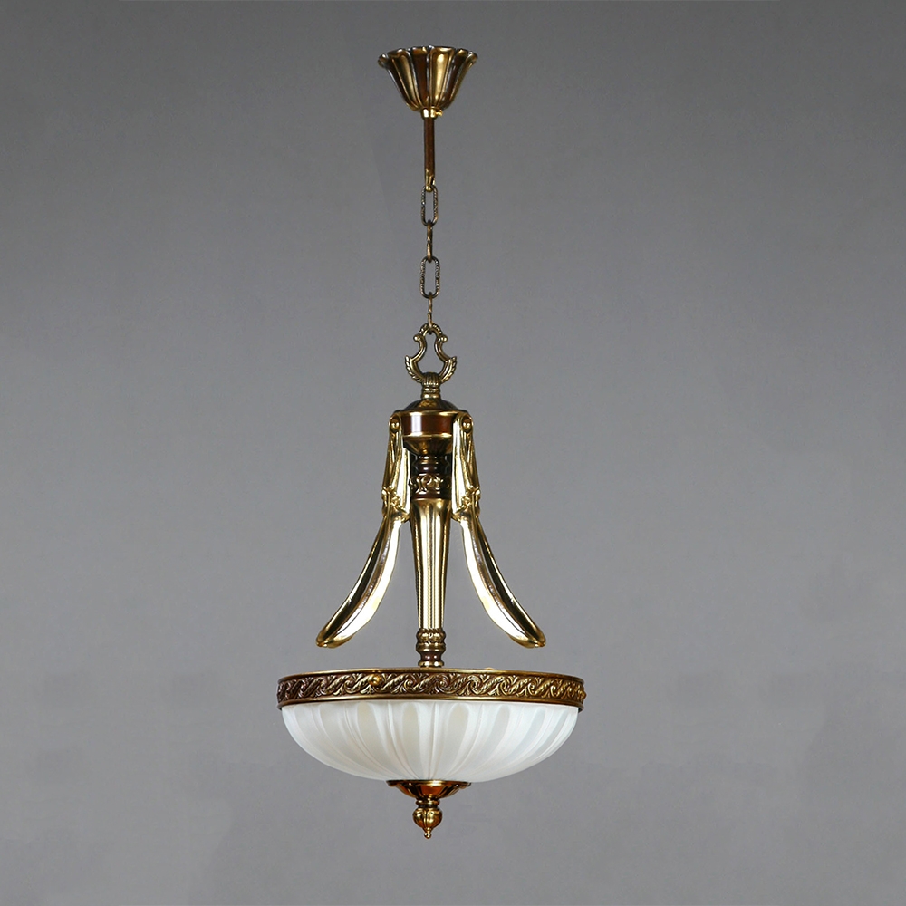 Люстра, выполненная из латуни в блестящей бронзовой отделке и абажуром из стекла.