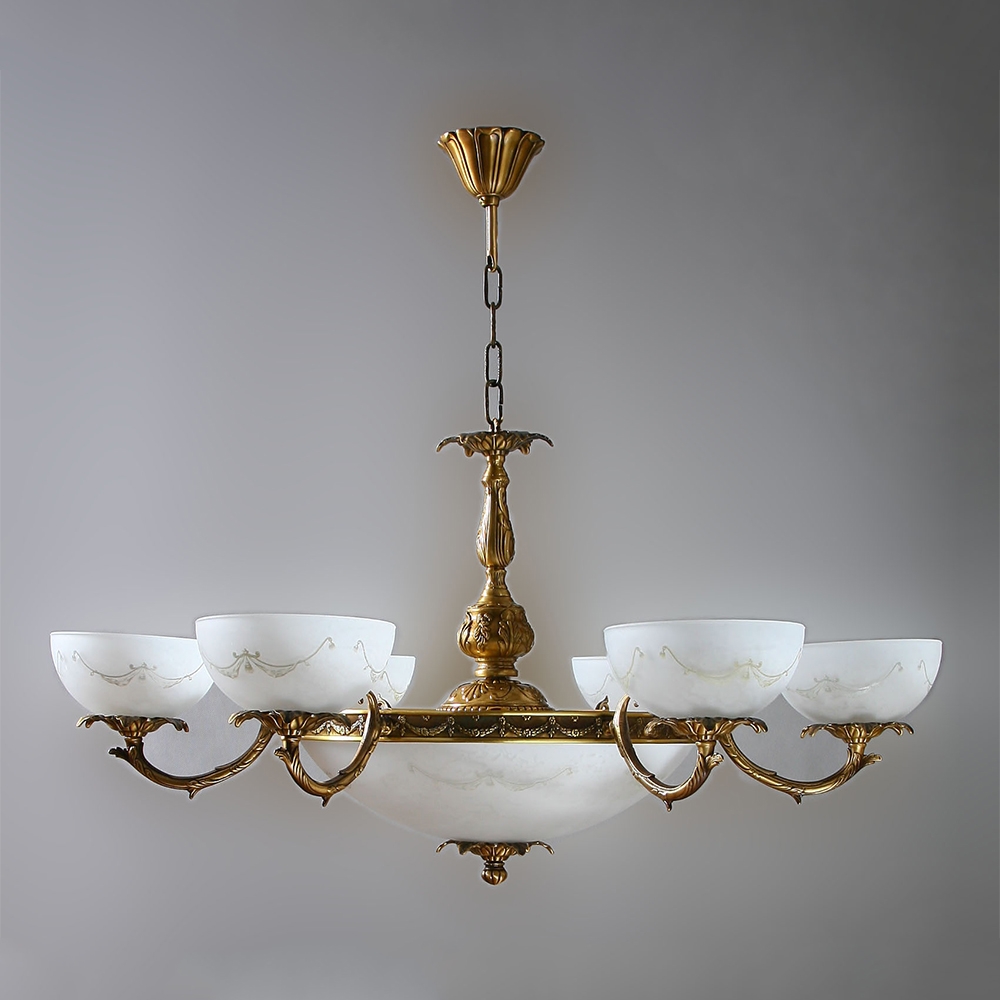 Люстра, выполненная из латуни в матовой бронзовой отделке и абажурами из белого стекла.