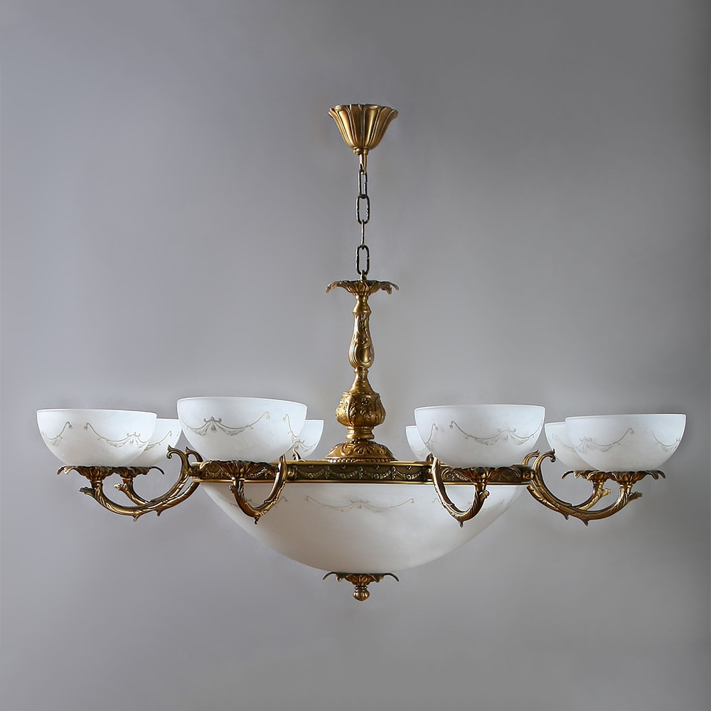 Люстра, выполненная из латуни в матовой бронзовой отделке и абажурами из белого стекла.