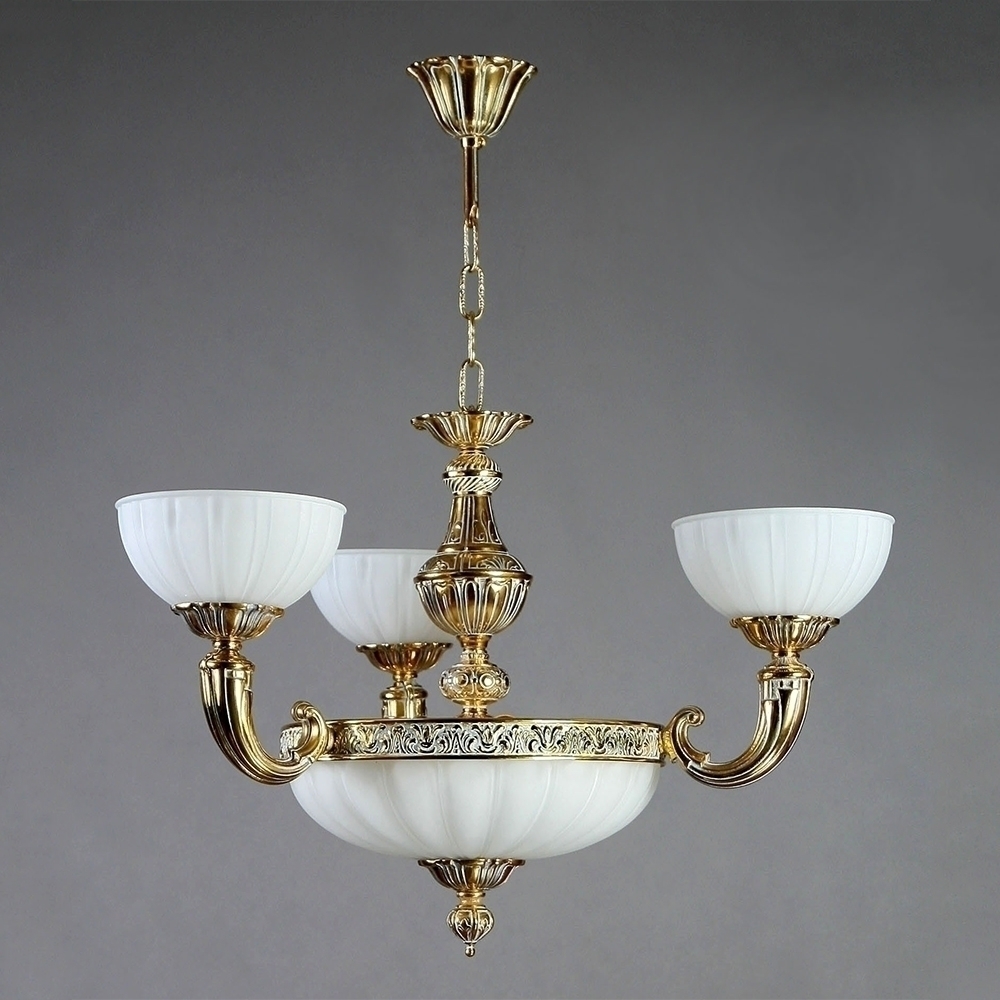 Люстра, выполненная из латуни в отделке "белая патина" с плафами из стекла белого цвета.