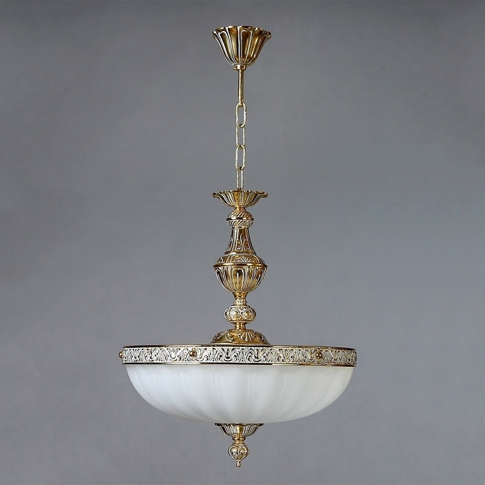 Потолочный светильник, выполненный из латуни в отделке "белая патина" с плафоном из стекла белого цвета.
