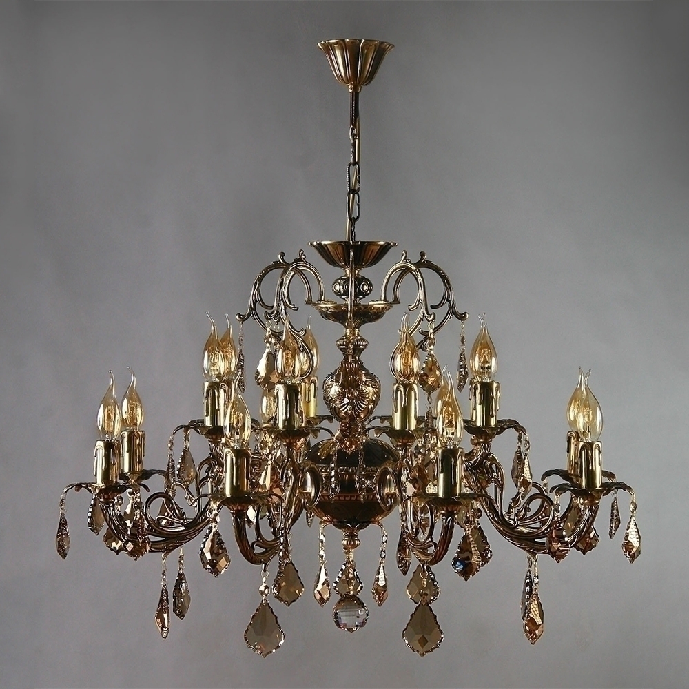 Люстра, выполненная из латуни в блестящей бронзовой отделке с подвесками в форме листа из хрусталя Asfour медового цвета.