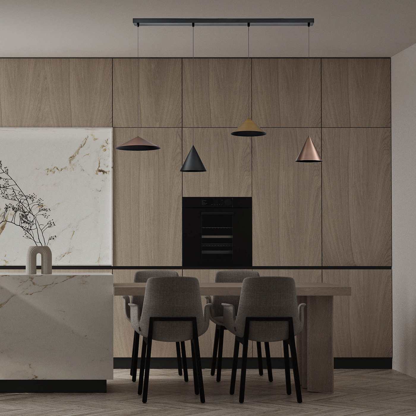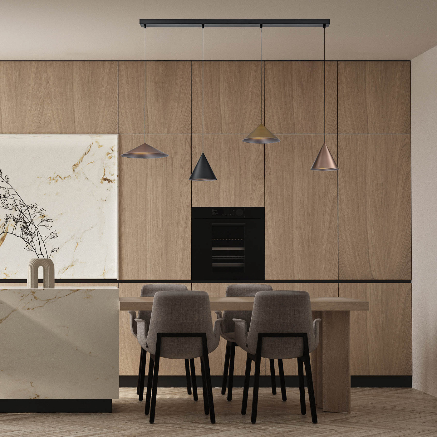 Подвесные светильники коллекции CONO— воплощение современного минимализма: строгие конические или усечённо-конические плафоны из матовой стали создают чёткий нисходящий световой поток и придают интерьеру архитектурную выразительность. Тонкий кабель и компактное потолочное основание подчёркивают лёгкость конструкции. Доступные цвета — от классического чёрного до медного и золотого — позволяют вписать светильники в любой стиль: от минимализма до скандинавского или лофта. Регулируемая высота подвеса даёт возможность точно задать уровень размещения и создать вертикальный акцент в пространстве. Светильники идеально подходят для локального освещения обеденных столов, барных стоек, кухонных островов и рабочих зон. Направленная форма плафона обеспечивает равномерное распределение света без бликов, а совместимость с натяжными потолками делает монтаж простым и безопасным. Используйте CONO в гостиных, кухнях, спальнях, прихожих, а также в кафе, ресторанах, офисах и зонах ожидания. Группировка нескольких светильников создаст ритмичную световую композицию, подчёркивая структуру помещения и выделяя ключевые зоны.