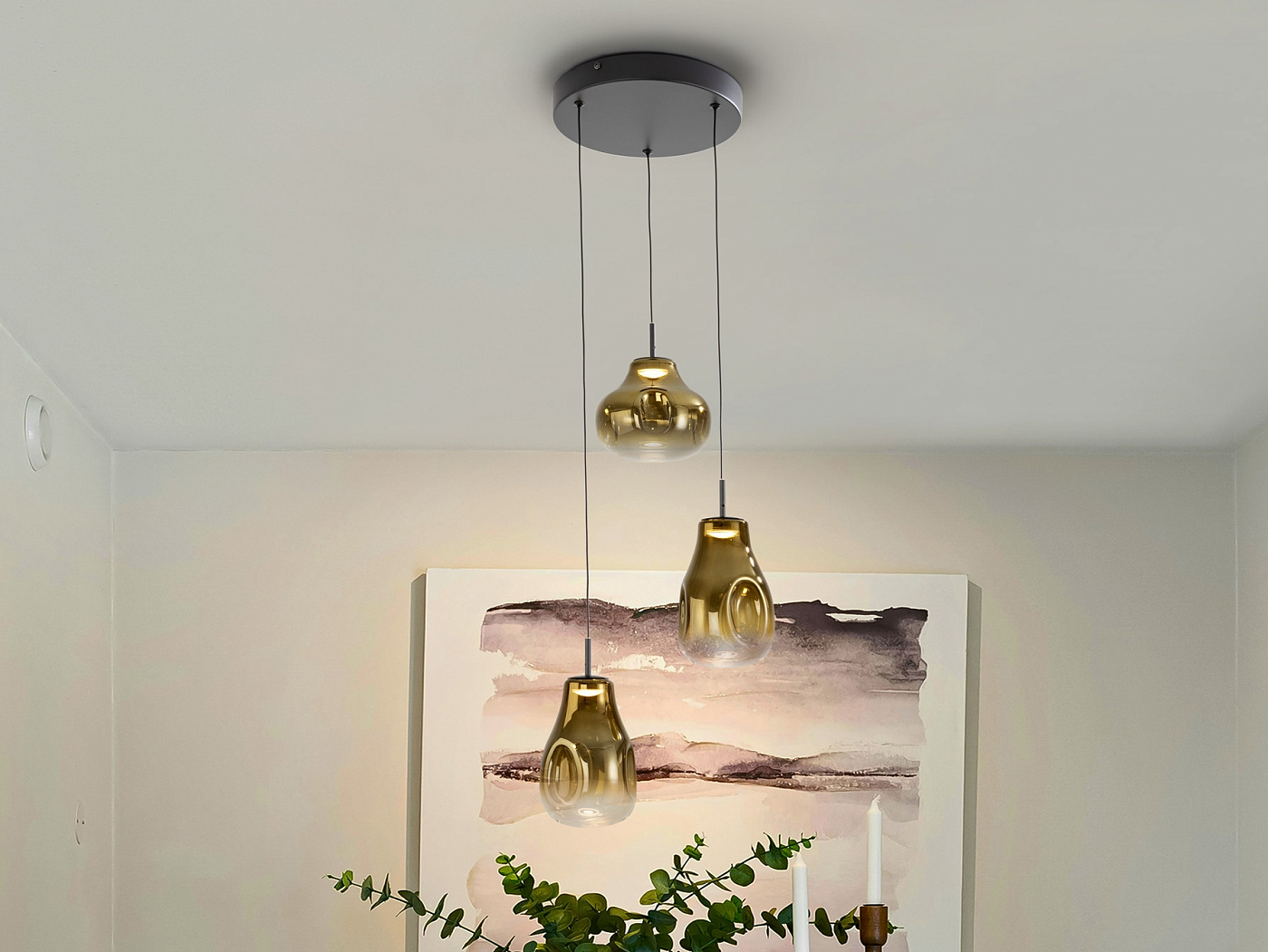 Лампа на 3 лампы из металла с матово-черной отделкой. Абажур из дутого стекла с размытой золотистой отделкой, переходящей в прозрачную. Регулируемая высота. Светодиод 18 Вт, 1000 лм, 3000 К. · Эта лампа оснащена ГРАВИТАЦИОННЫМИ ПЕРЕКЛЮЧАТЕЛЯМИ для улучшения фиксации на потолке. Доступна версия на 110 В.
