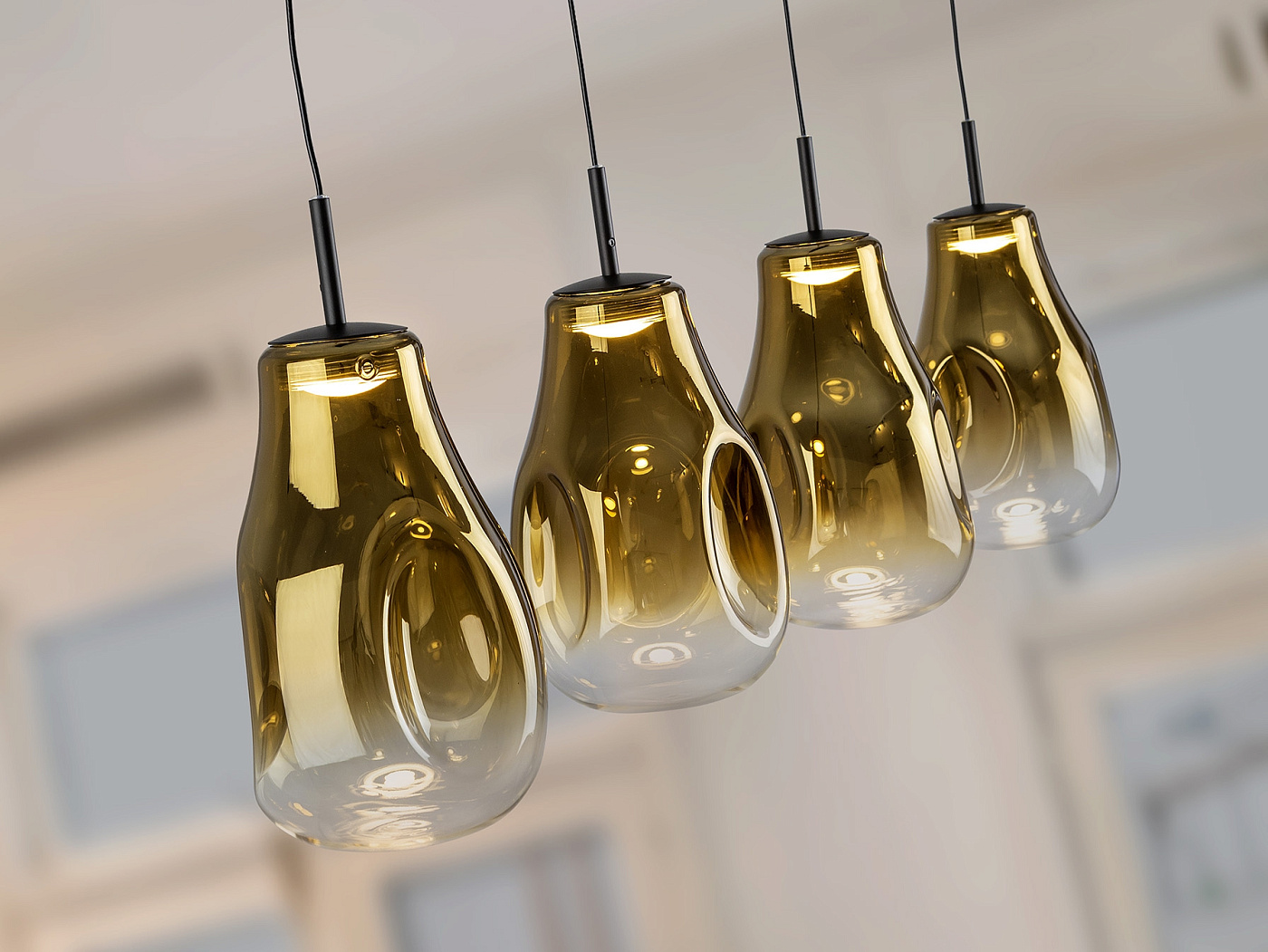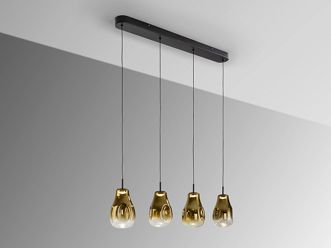 Лампа на 4 лампы из металла с матово-черной отделкой. Абажуры из дутого стекла с размытой золотистой отделкой, переходящей в прозрачную. Регулируемая высота. Светодиод 24 Вт, 1400 лм, 3000 К. · Эта лампа оснащена ГРАВИТАЦИОННЫМИ ПЕРЕКЛЮЧАТЕЛЯМИ для улучшения фиксации на потолке. Доступна версия на 110 В.
