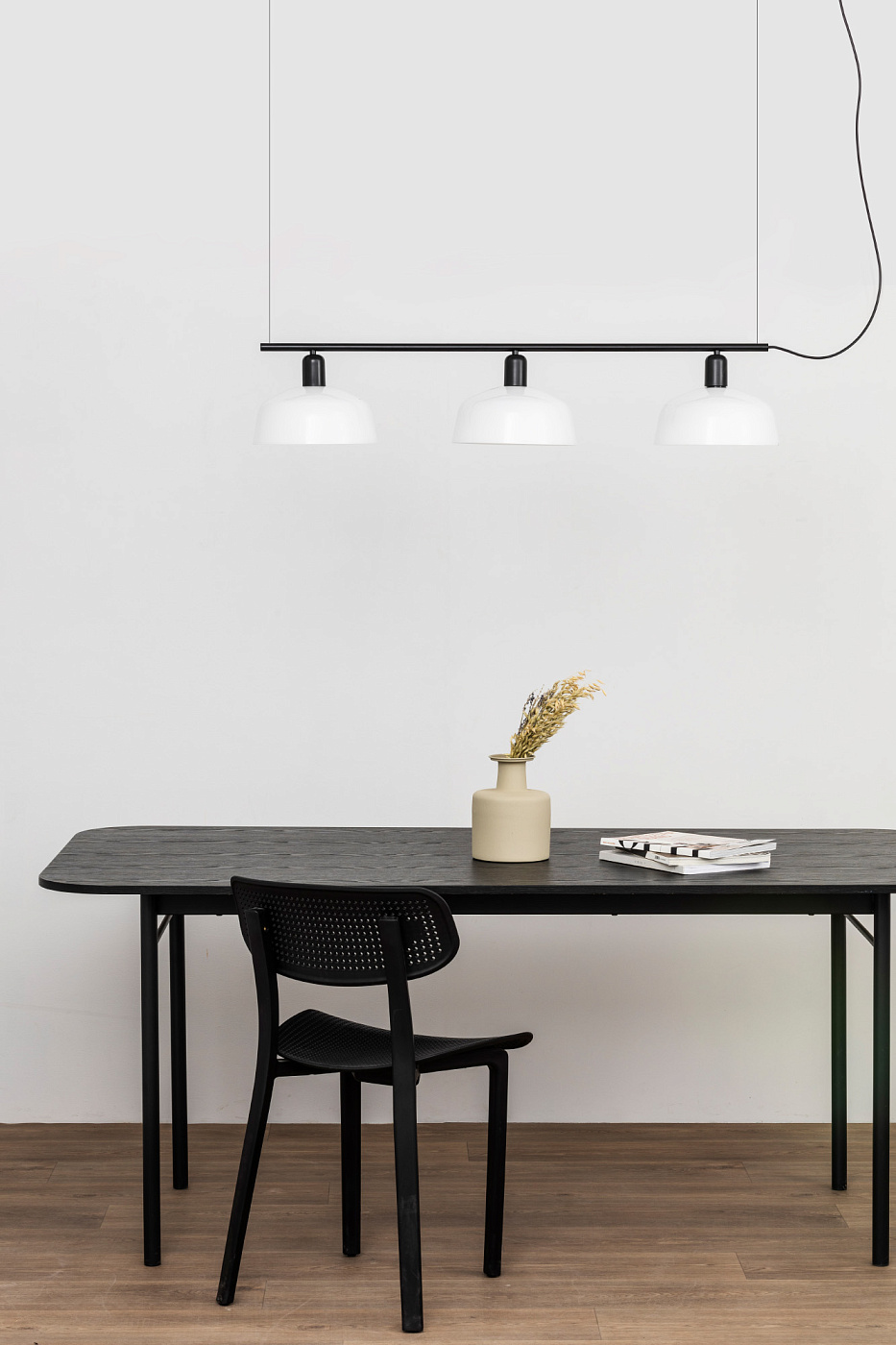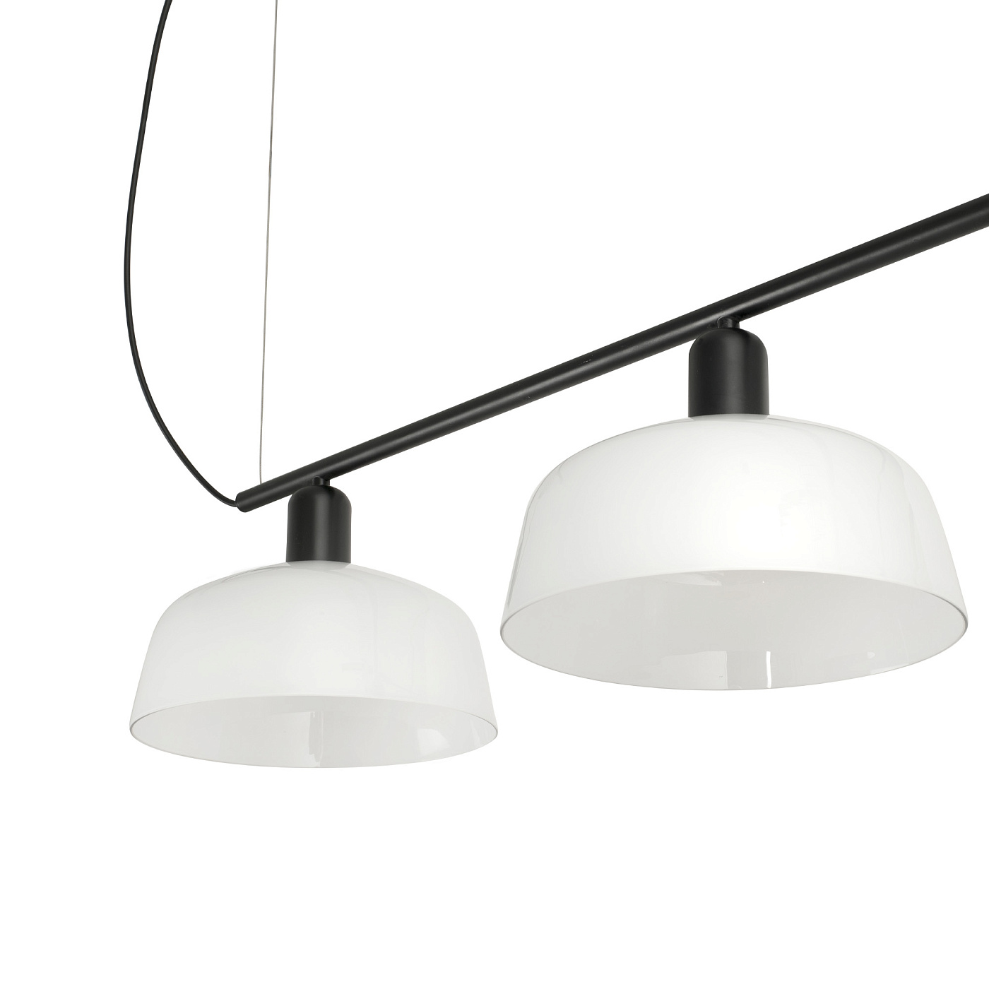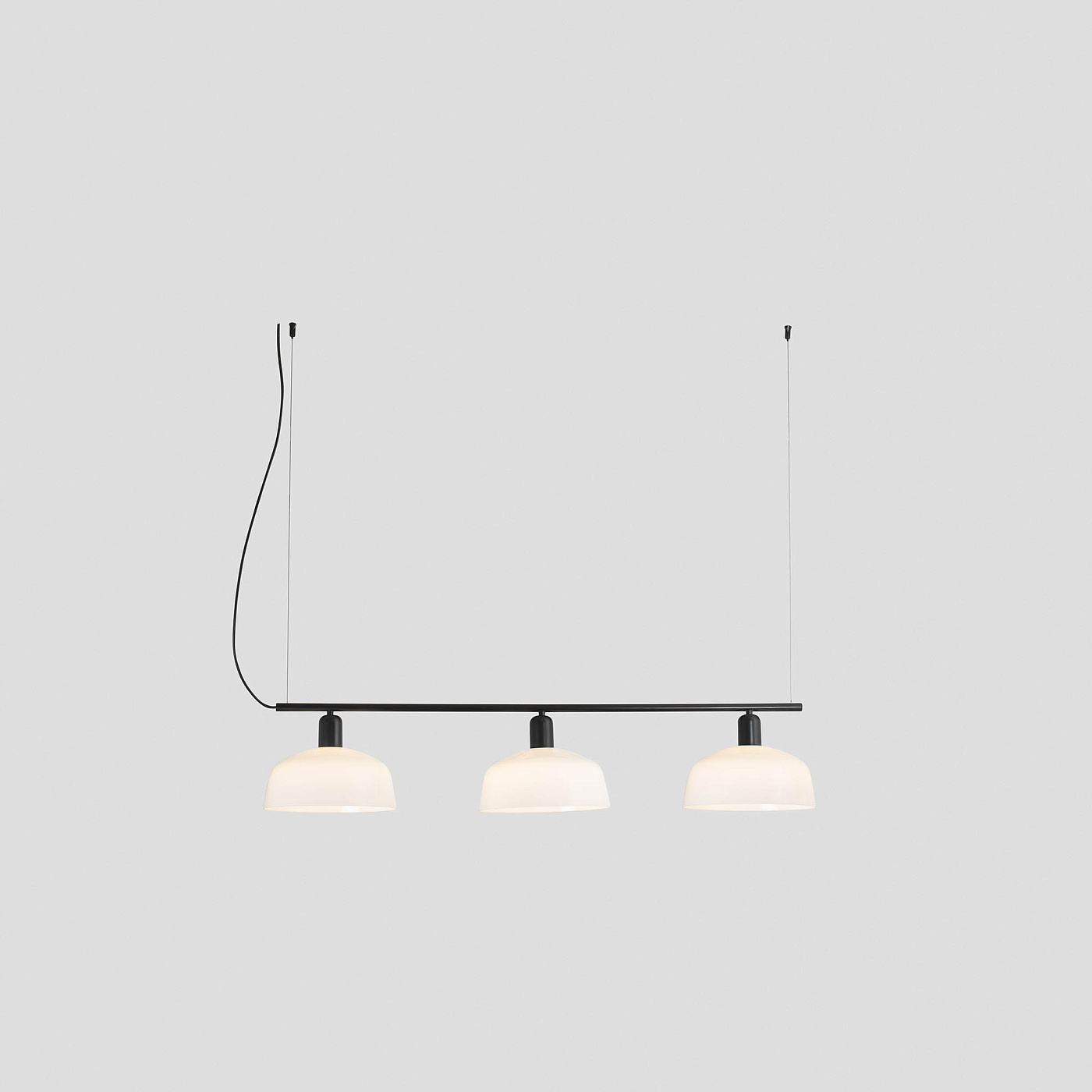 TATAWIN LINEAL M — это семейство светильников, разработанное Адольфо Абейоном. Форма тени напоминает верхнюю часть характерных домов Татауина, города на юго-востоке Туниса. Этот черный линейный подвесной светильник имеет абажур из белого опалового стекла.
