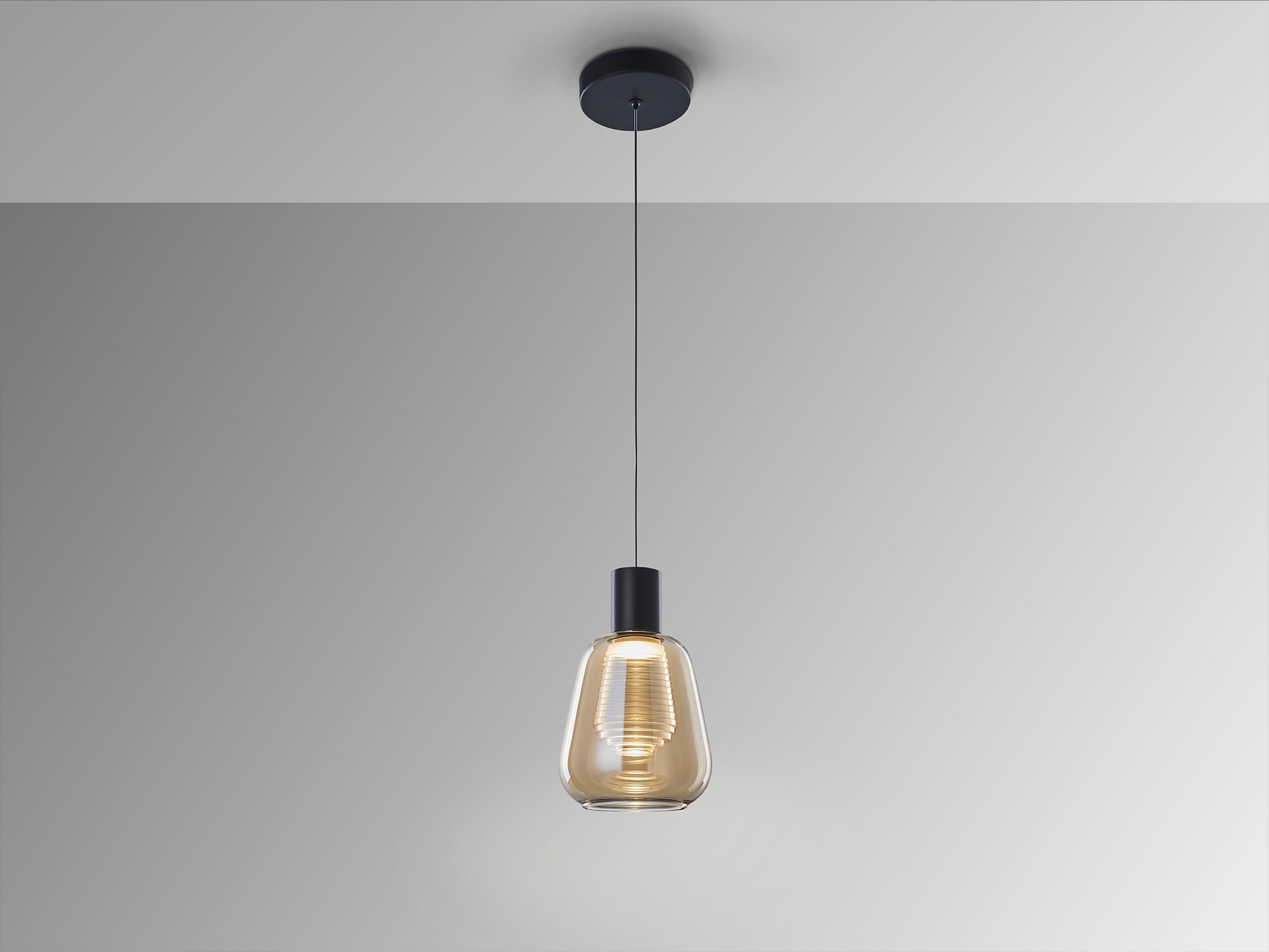 Лампа на 1 лампу, изготовлена из металла с черной матовой отделкой. Двойной абажур, внешний корпус из янтарного стекла и внутренний рассеиватель из прозрачного поликарбоната с расположенными в шахматном порядке полосками. Регулируется по высоте. Светодиод мощностью 5 Вт, 350 лм, 3000 К