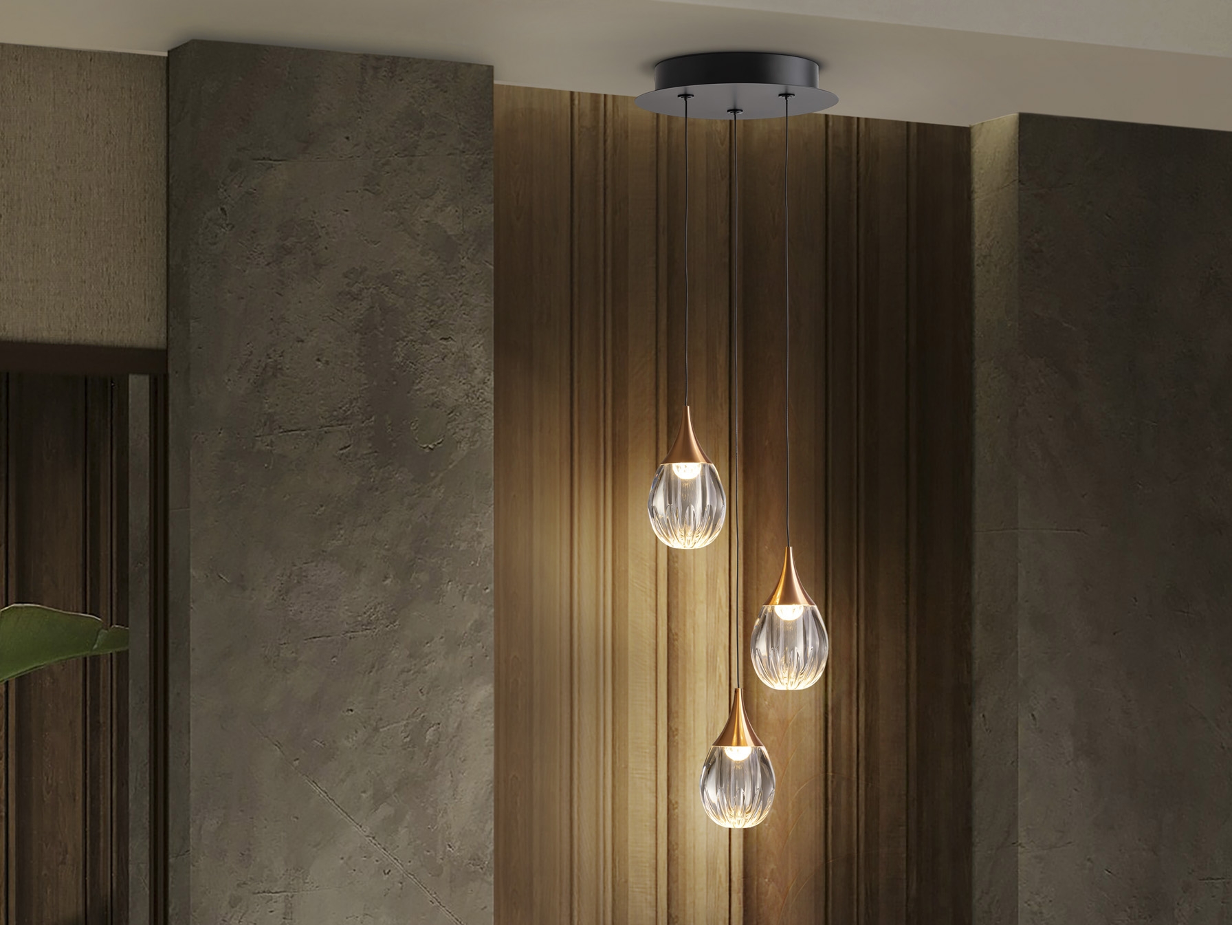 Светильник на 3 лампы из металла с отделкой матово-черного цвета и медными деталями. Абажуры из прозрачного акрила. Регулируемая высота. Светодиод 18 Вт, 639 лм, 3000 К. · Эта лампа оснащена ГРАВИТАЦИОННЫМИ ПЕРЕКЛЮЧАТЕЛЯМИ для улучшения фиксации на потолке. Доступна версия на 110 В.