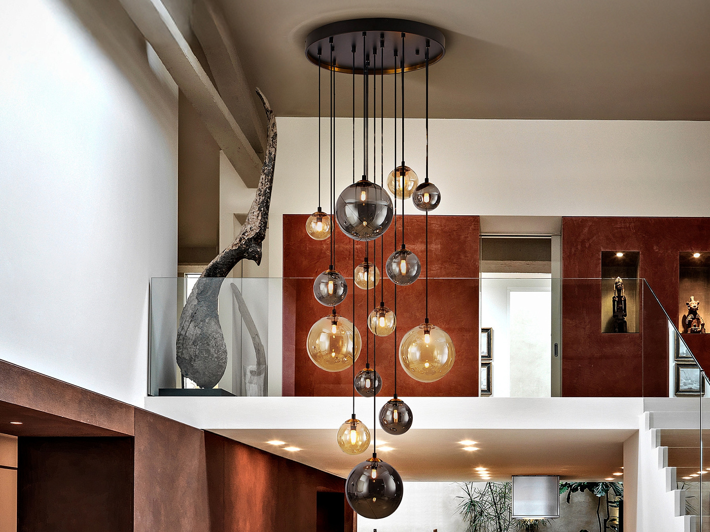 Светильник на 14 ламп, изготовлен из металла, покрытого матовым черным лаком, с деталями из сатинированной латуни. Сферические стеклянные плафоны размером 10, 12 и 20 см, выполненные в янтарном и мерцающем дымчато-сером цвете. Регулируется по длине до 500 см.