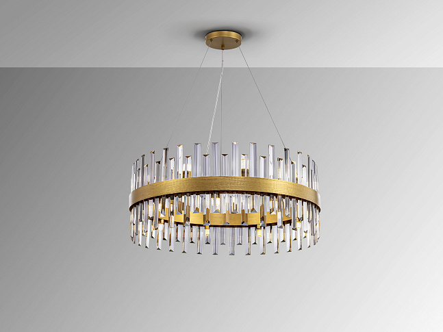 Круглый светильник на 18 ламп из матового металла с золотым покрытием. Рассеиватель из прозрачных стеклянных прутков призматической формы. ·В комплект поставки входят 18 светодиодных ламп G9 мощностью 4 Вт. Лампа оснащена GRAVITY TOGGLES для улучшения фиксации на потолке.