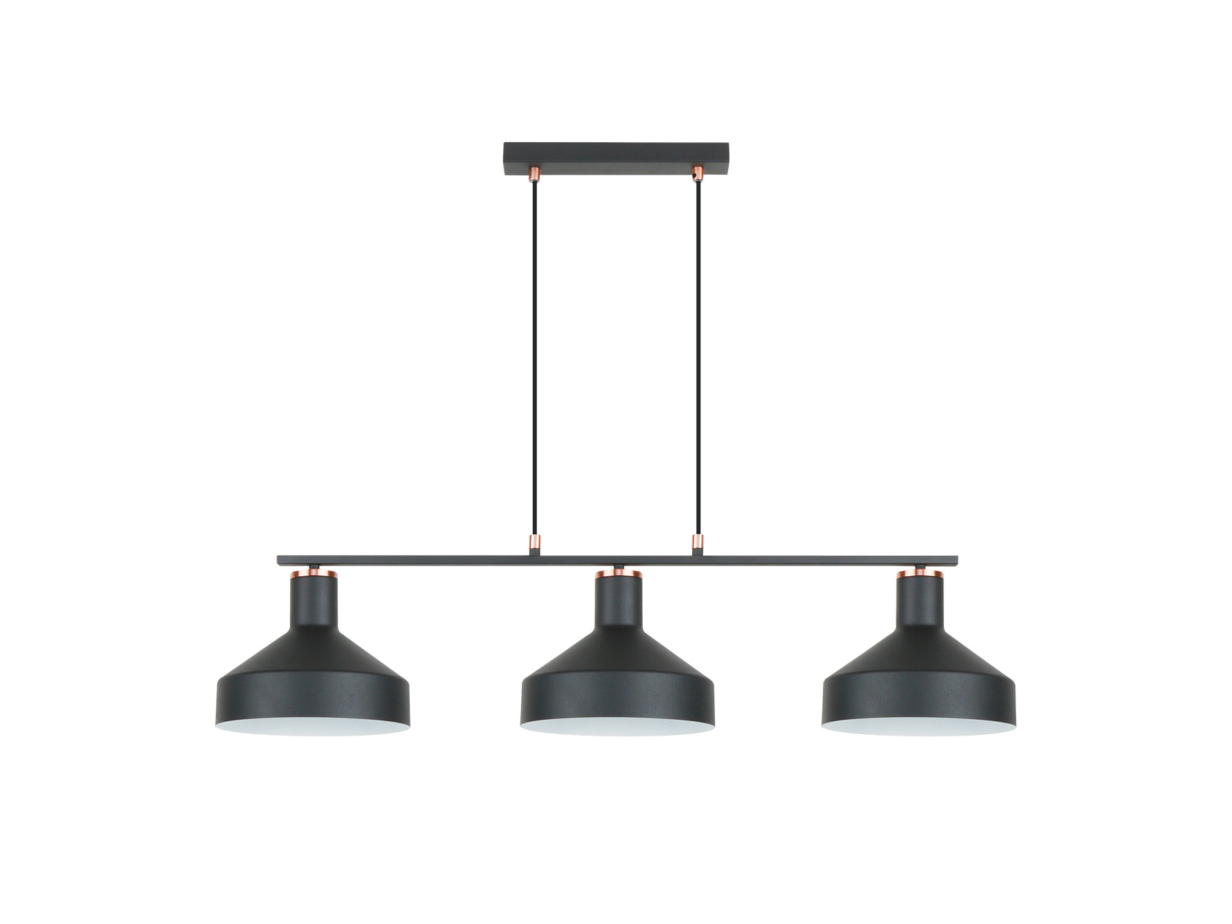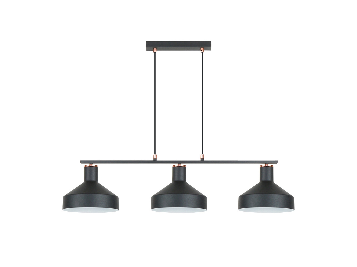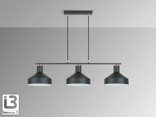 Лампа из 3 лампочек в линию, выполнена из металла, отделка матово-черная, детали из сатинированной меди. Регулируемая высота. 3 E27
