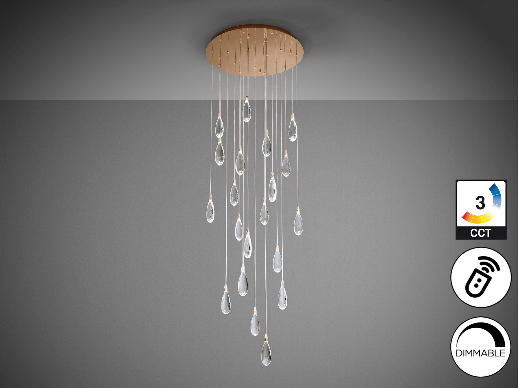 Светильник из стали и металла, отделка из розового золота. 20 лампочек с гранёными стеклянными каплями с крапинками. Регулируемая высота. Светодиодное освещение мощностью 40 Вт, цветовая температура: 2700–6000 К, 4000 лм, с регулировкой яркости. В комплекте пульт дистанционного управления. · Этот светильник оснащен системой GRAVITY TOGGLES для лучшего крепления на потолке. В светильнике используется диммер и радиочастотный пульт дистанционного управления для регулировки интенсивности и цветовой температуры. Совместим с приложением TUYA для управления освещением со смартфона или планшета.