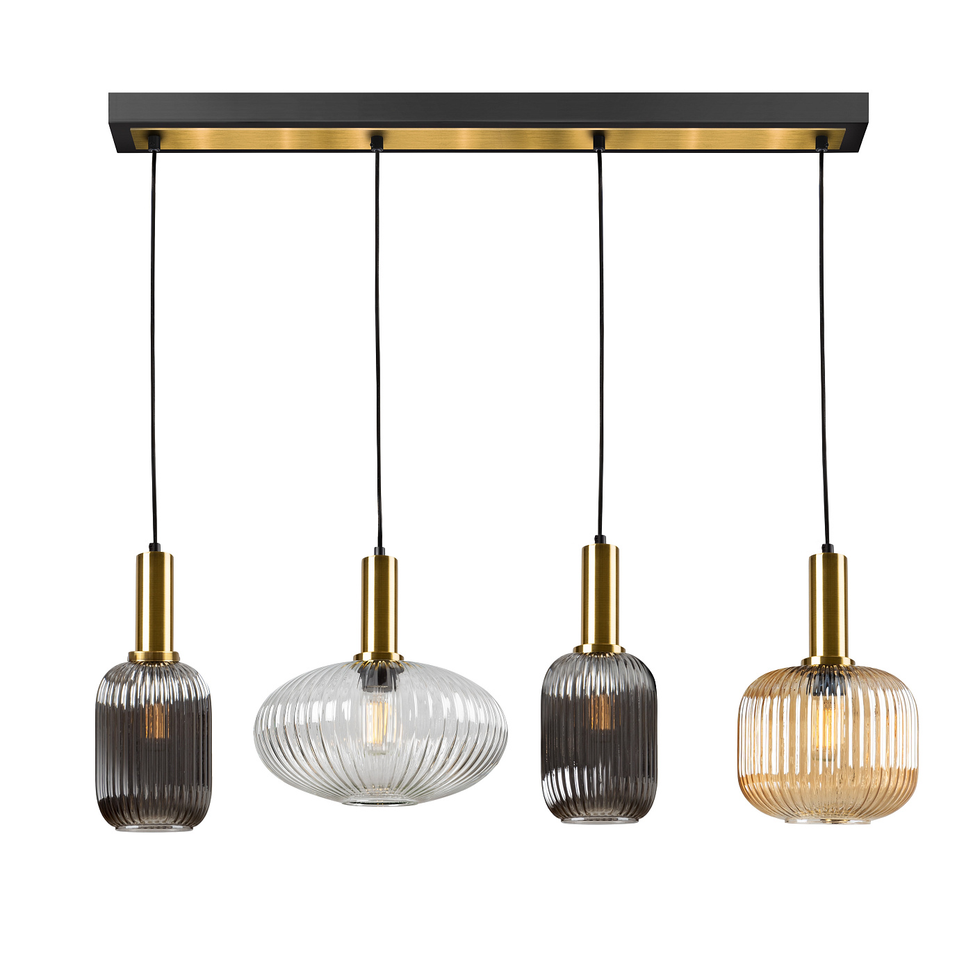 Люстра из 4 ламп в линию из металла, матовая черная отделка, с деталями из сатинированной латуни. Абажуры из формованного стекла с отделкой из прозрачного, янтарного и дымчатого зеркально-серого цвета. Регулируется по длине. Этот товар включает в себя 4 светодиода E27 мощностью 8 Вт. DIMABLE. Этот товар включает в себя 1 светодиод E27 8 Вт. DIMABLE.