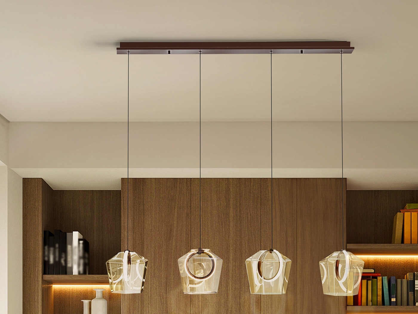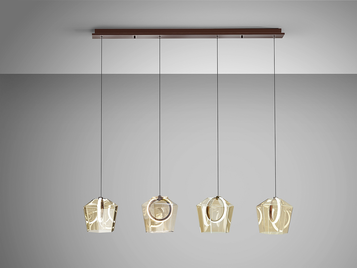 Лампа на 4 лампы из матового алюминия, окрашенного в темно-бронзовый оттенок. Абажуры из тонированного стекла цвета шампанского с внутренним светодиодным кольцом и силиконовым рассеивателем. Светодиод 24 Вт, 644 лм, 3000 К В этом продукте используется светодиодный драйвер с симисторным типом и регулировкой яркости 0-10 В. Яркость можно регулировать с помощью настенного светодиодного диммера с этими функциями. · Эта лампа поставляется с ГРАВИТАЦИОННЫМИ ПЕРЕКЛЮЧАТЕЛЯМИ для улучшения фиксации на потолке.