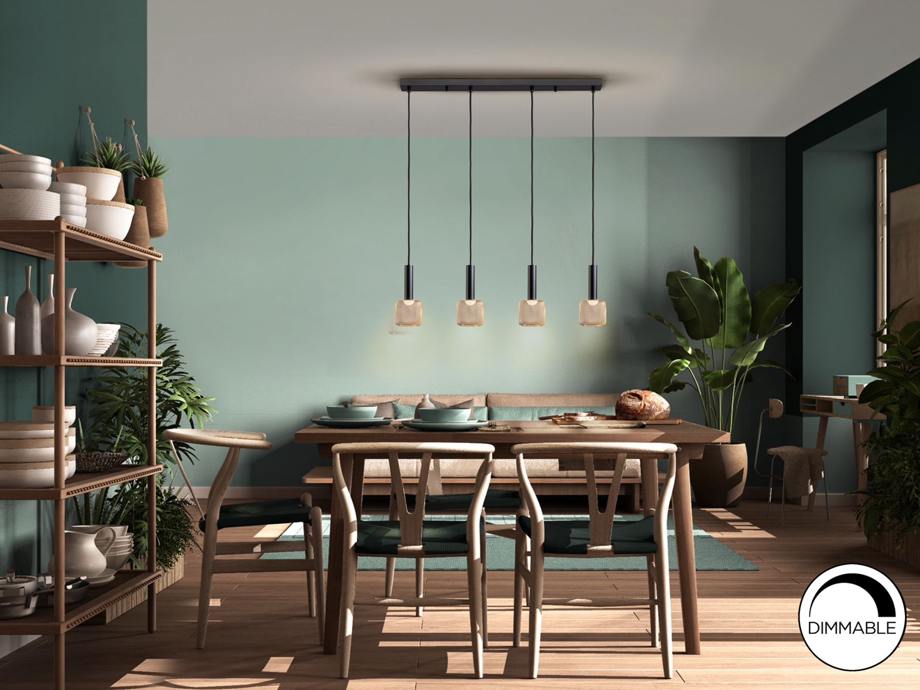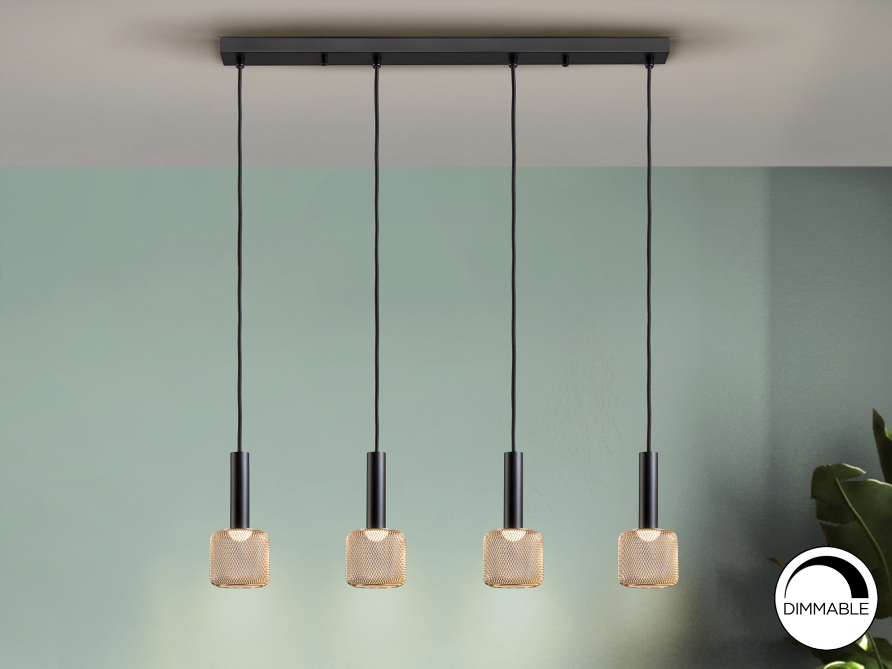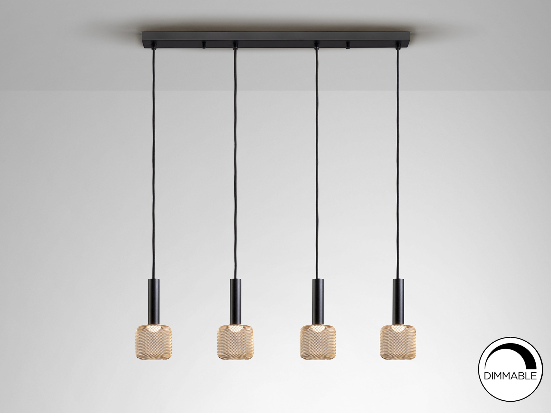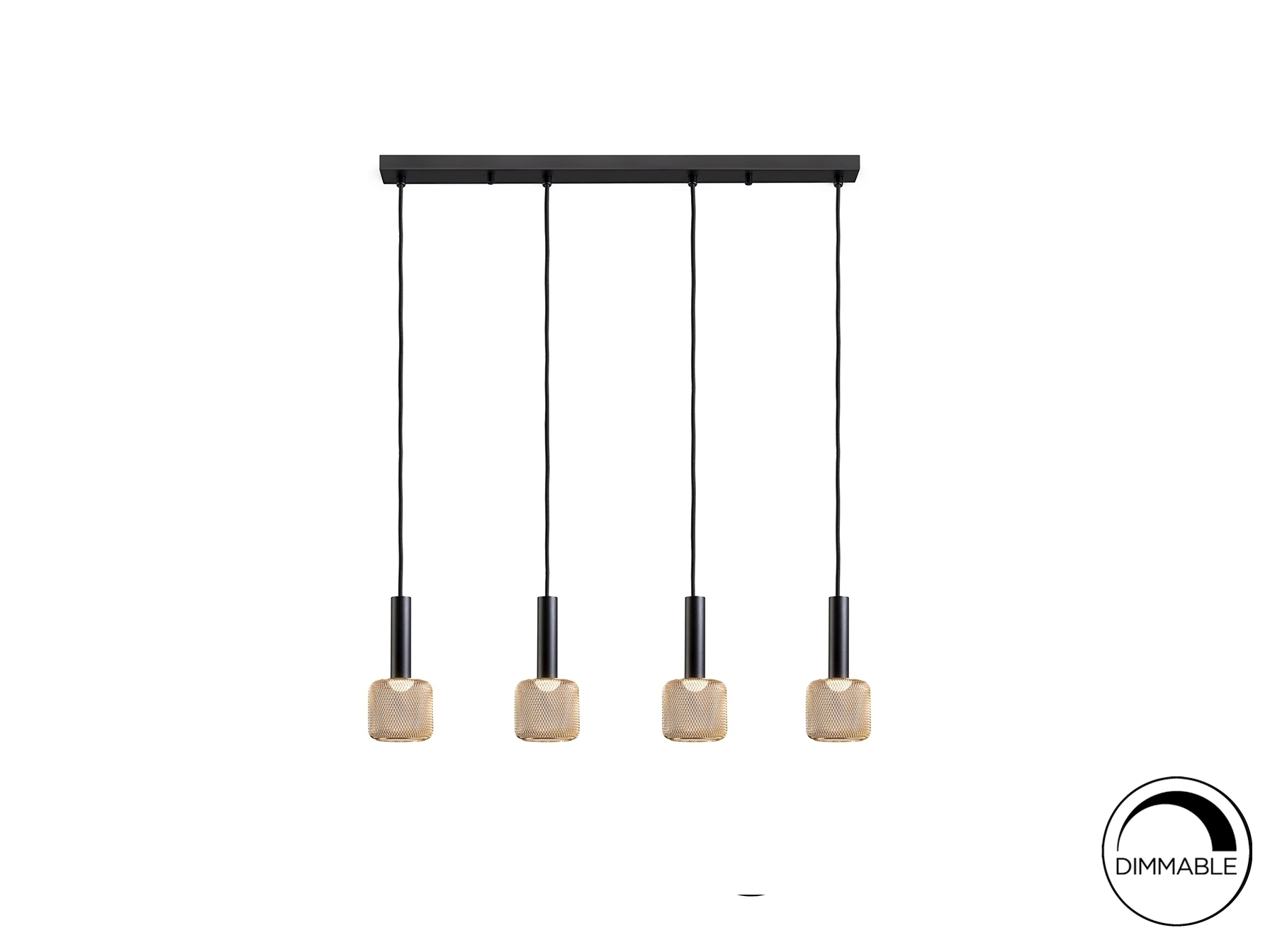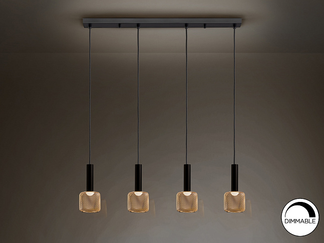 Светодиодная лампа на 4 света из матового черного металла и абажура из металлической блестящей металлической сетки, рассеиватель из опалового акрила. Светодиод 20 Вт, 1800 лм, 3000 К. С возможностью затемнения.
