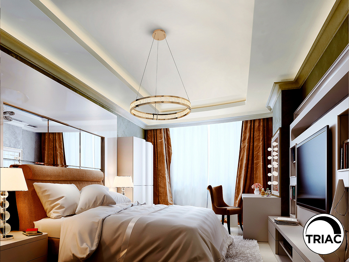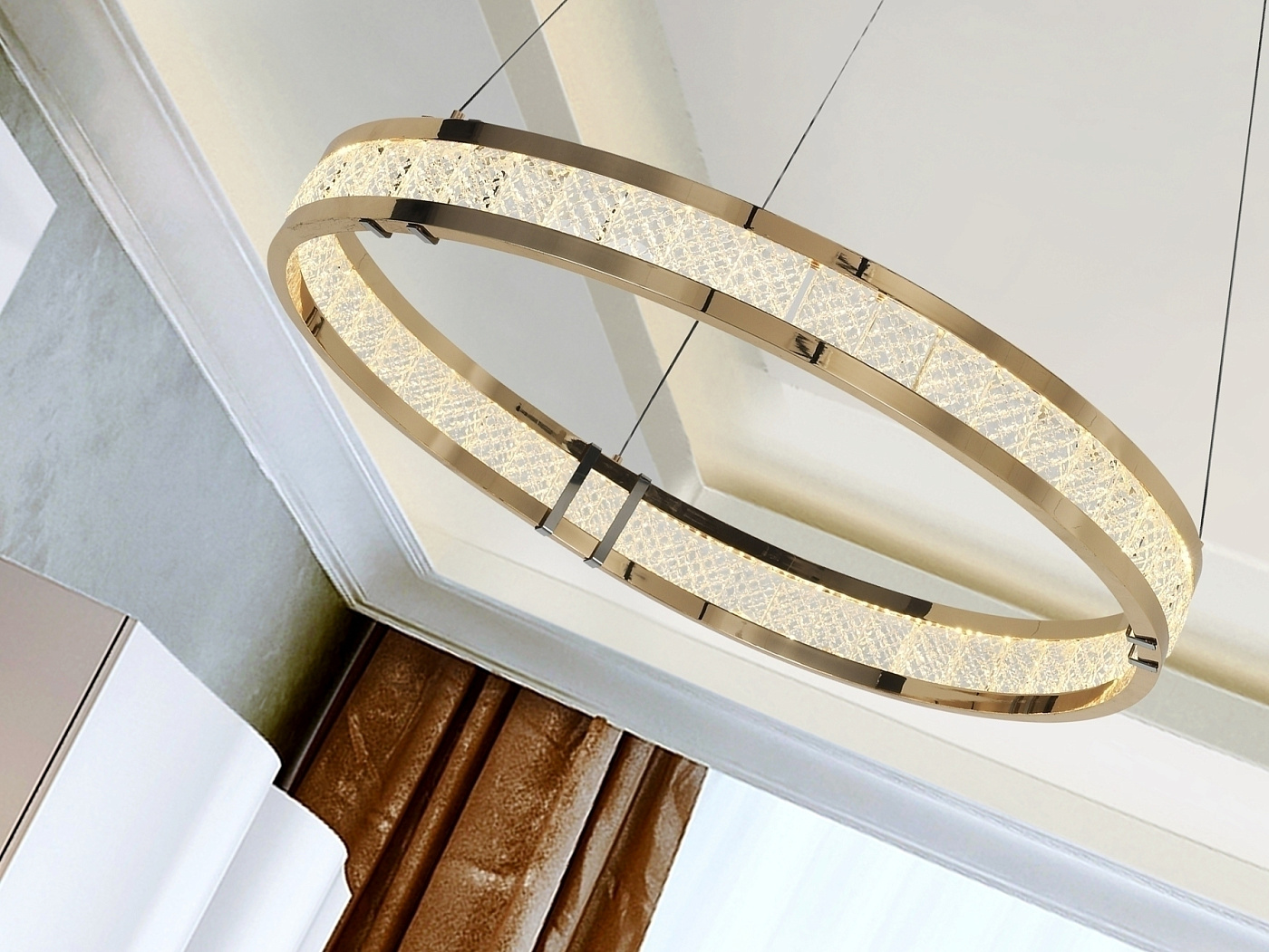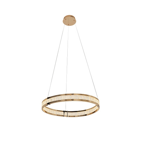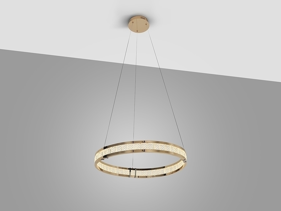 Лампа с тремя кольцами, изготовлена из стали и алюминия, блестящая золотистая отделка. Рассеиватель из текстурированных стеклянных кусочков. Регулируемая высота. Светодиодное освещение 26 Вт, 2.300 лм, 3.000 К. РЕГУЛИРУЕМАЯ ЯРКОСТЬ, ТРИАК. · Эта лампа поставляется с ГРАВИТАЦИОННЫМИ ПЕРЕКЛЮЧАТЕЛЯМИ для улучшения крепления к потолку. В этом продукте используется светодиодный драйвер с симисторным типом и регулировкой яркости 0-10 В. Яркость можно регулировать с помощью настенного светодиодного диммера с этими функциями...доступна версия на 110 В.