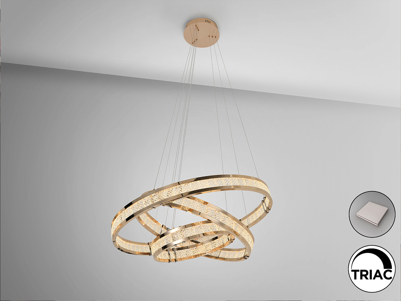 Лампа с тремя кольцами, изготовлена из стали и алюминия, блестящая золотистая отделка. Рассеиватель из текстурированных стеклянных кусочков. Регулируемая высота. Светодиодное освещение 79 Вт, 3000 К, 6300 лм. В комплект входят драйвер TRIAC и КОМПЛЕКТ ДЛЯ ДИММИРОВАНИЯ · Эта лампа поставляется с ГРАВИТАЦИОННЫМИ ПЕРЕКЛЮЧАТЕЛЯМИ для улучшения крепления на потолке. Этот продукт использует светодиодный драйвер с симистором и регулировкой яркости 0-10 В, включает в себя набор диммера с диммером и радиочастотным пультом дистанционного управления, или его можно регулировать с помощью симистора или настенного диммера 0-10 В... доступна версия на 110 В.