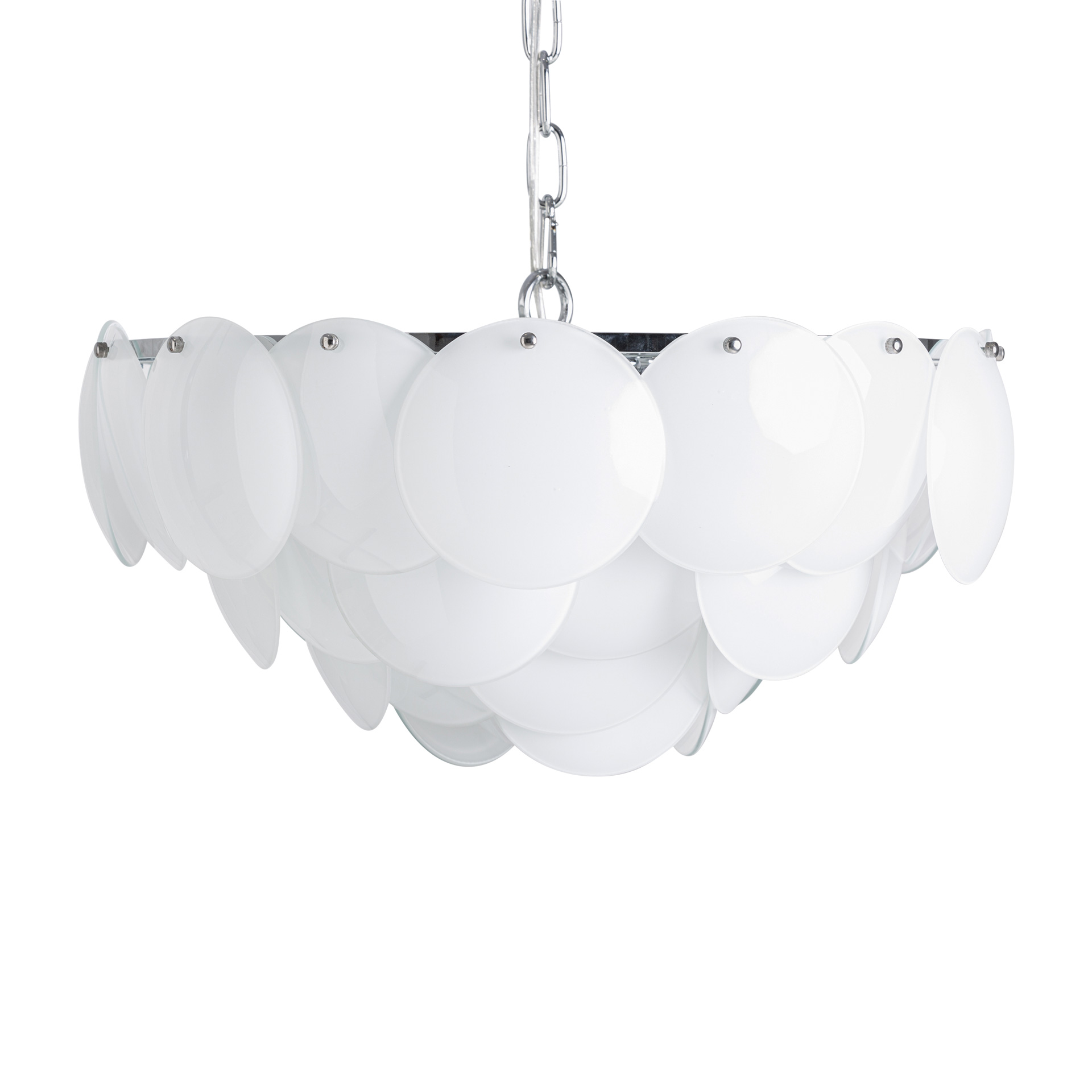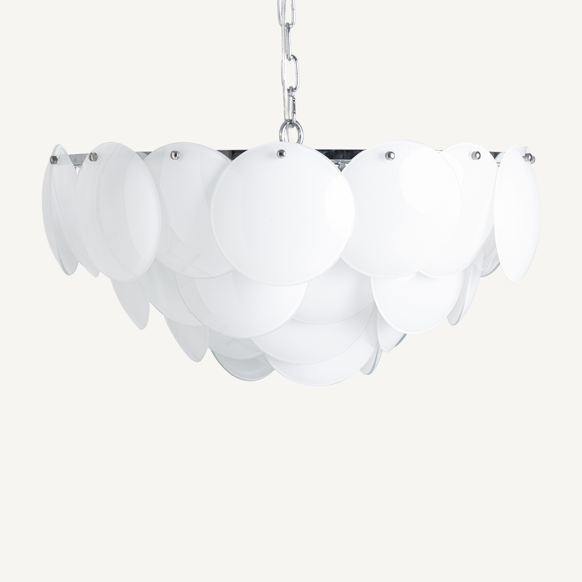 Подвесной светильник, изготовленный из стекла цвета слоновой кости в сочетании со сталью серебристого цвета. Ширина: 60 см, Глубина: 60 см, Высота: 34 см