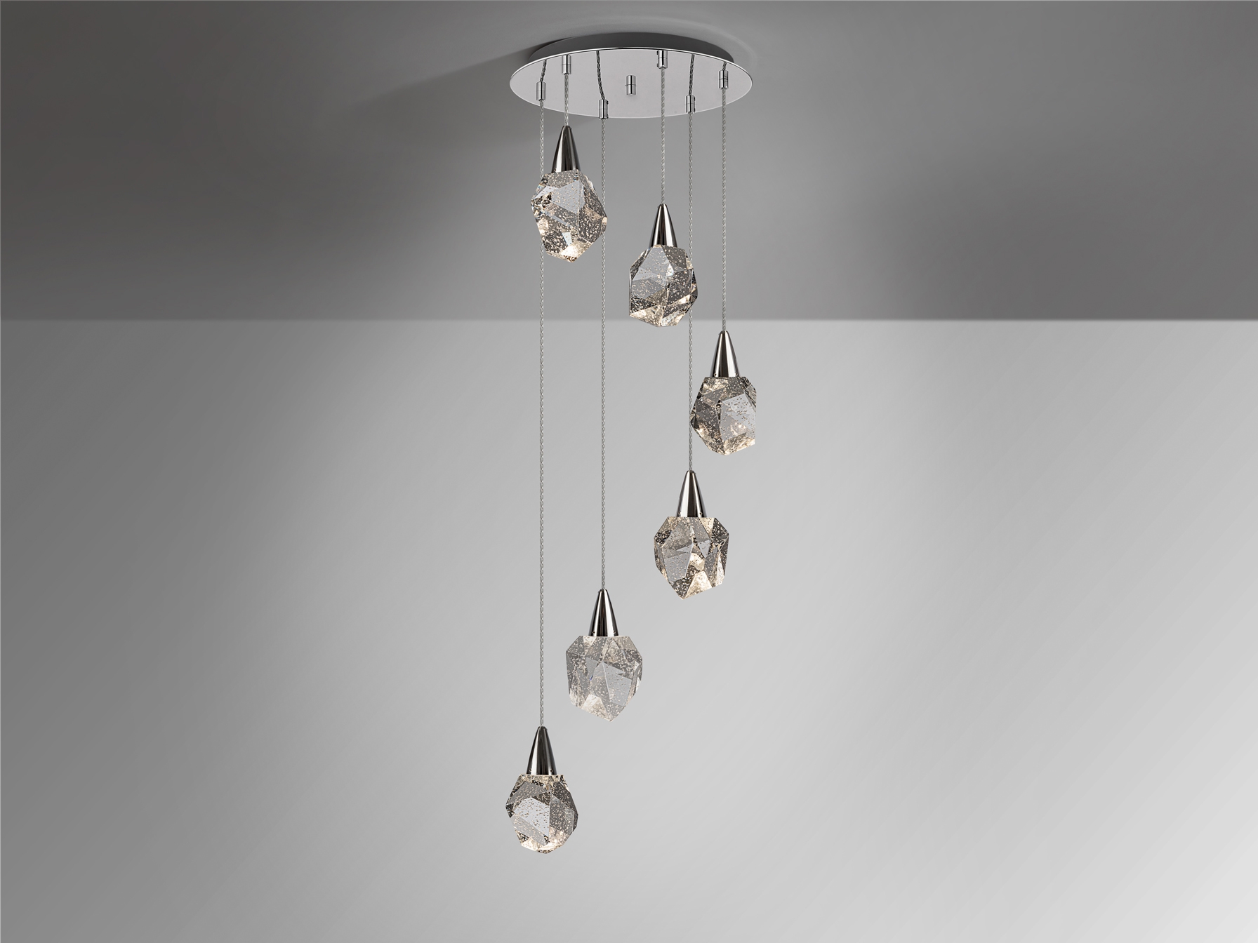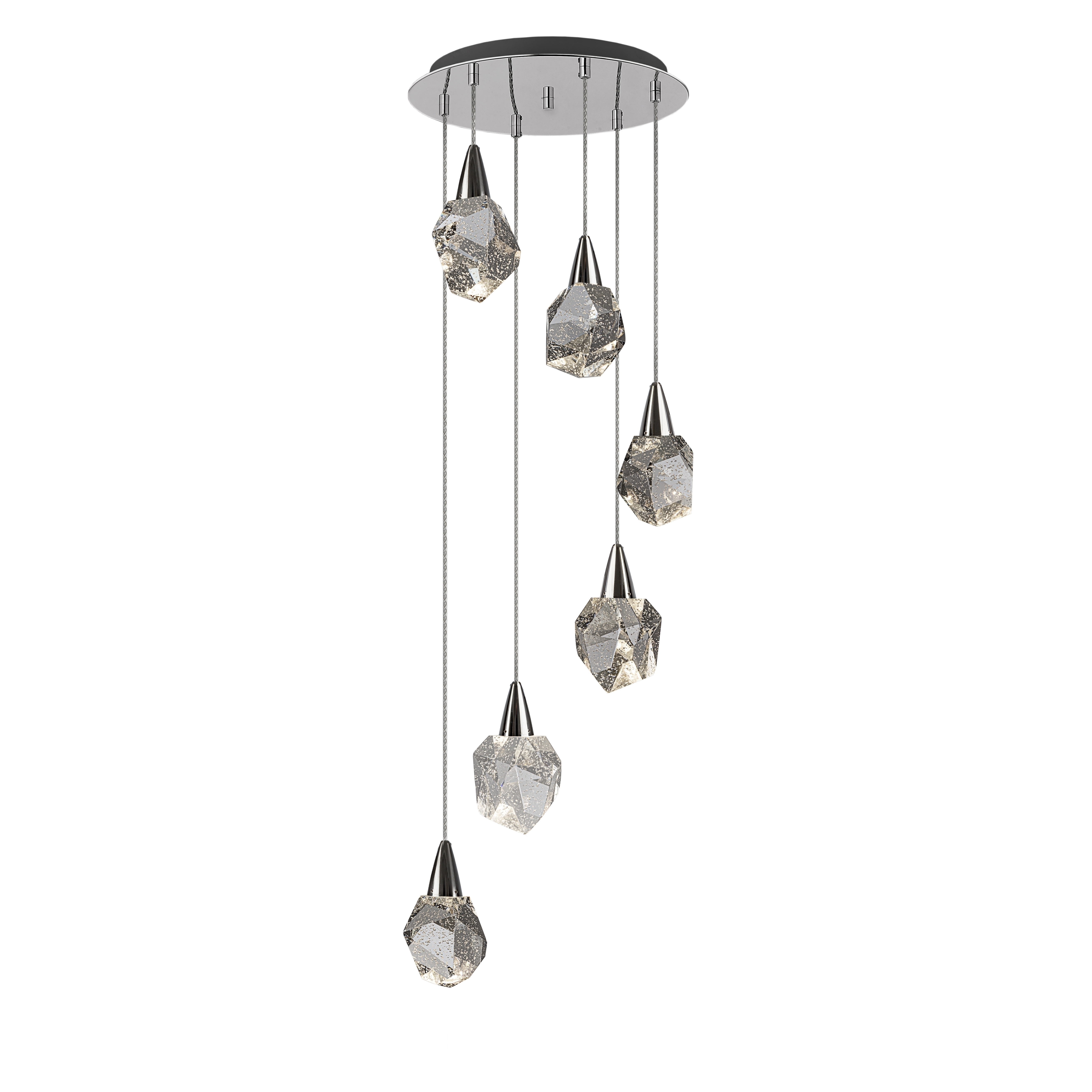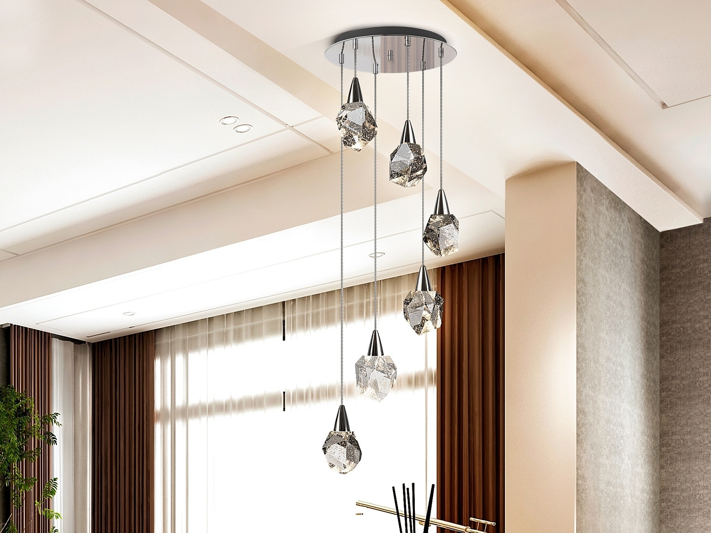 Светильник из 6 светодиодов, изготовлен из металла, отделка хром. Многогранные плафоны из цельного стекла с декоративными пузырьками внутри. Регулируется по высоте. Светодиод 24Вт. 2700 лм. 3000 К.