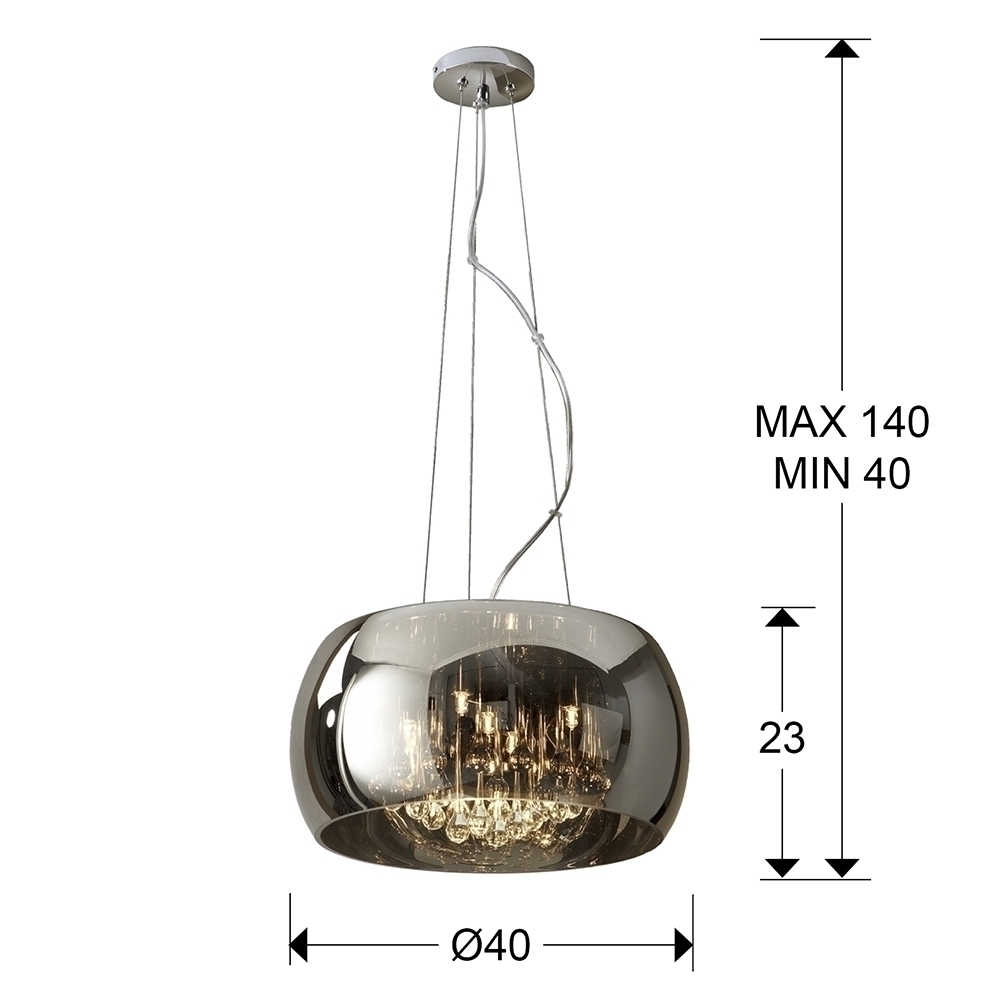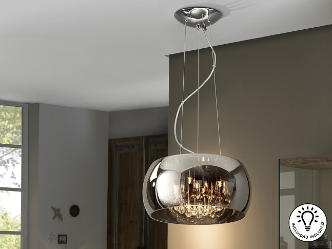Подвесной светильник из металла с покрытием "хром", плафон из зеркального стекла с подвесками внутри из стекла подобного муранскому. Включает 5 светодиодов G9 мощностью 6 Вт.