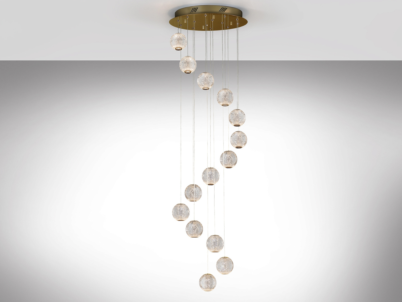 Круглый светильник с 14 светодиодами, металл с золотым покрытием. Сферические абажуры Ø 11 см из прозрачного оптического акрила, граненый дизайн. 69Вт LED. 3200K, 3745 лм.