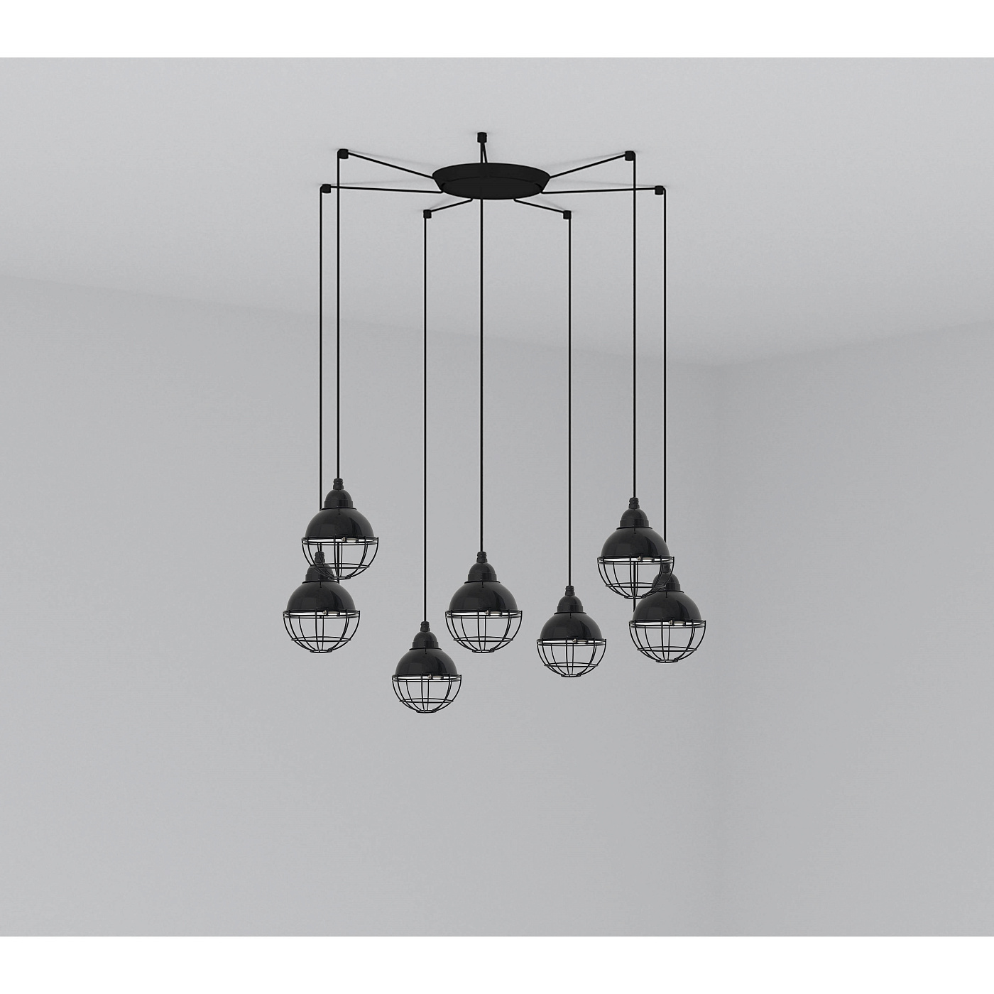 CLAIRE - черный подвесной светильник с круглой металлической структурой и решеткой черного цвета. Его дизайн вдохновлен огнями, которые освещали рыбацкие лодки. Доступен в других цветах. Версия с несколькими потолочными розетками с 7 лампами.