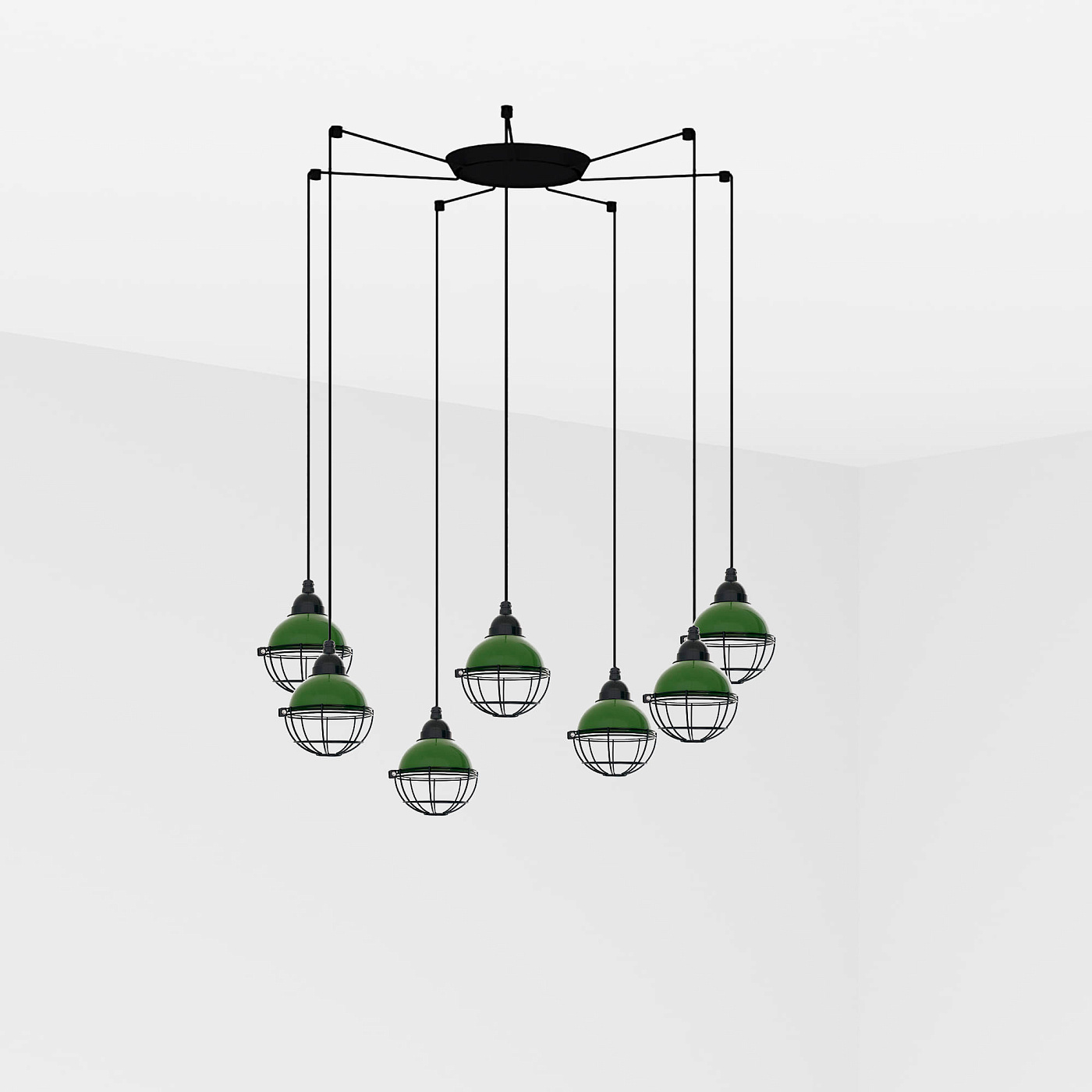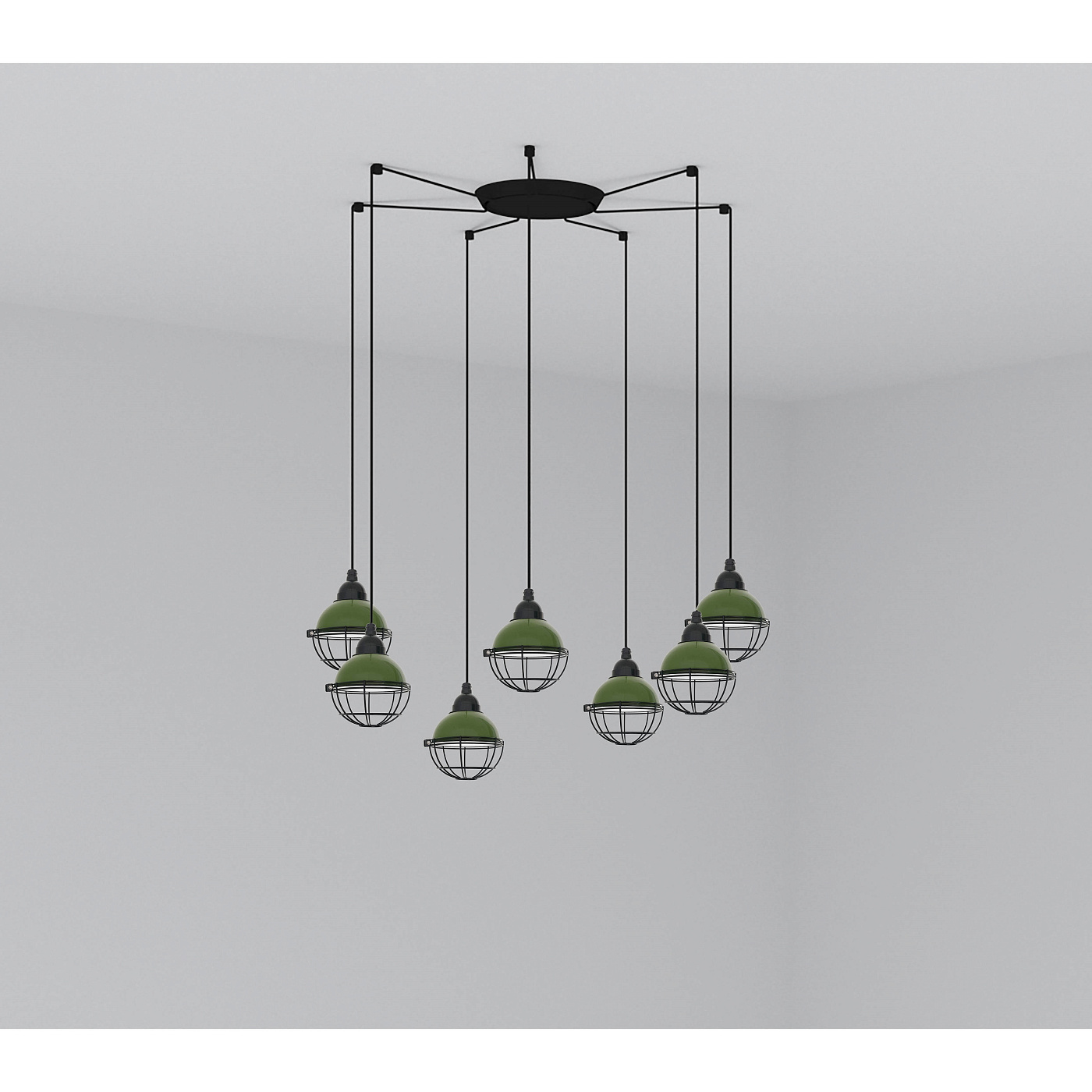 CLAIRE - это зеленый подвесной светильник с круглой металлической структурой и зеленой решетчатой частью. Его дизайн вдохновлен огнями, которые освещали рыбацкие лодки. Доступен в других цветах. Версия с несколькими потолочными розетками с 7 лампами.