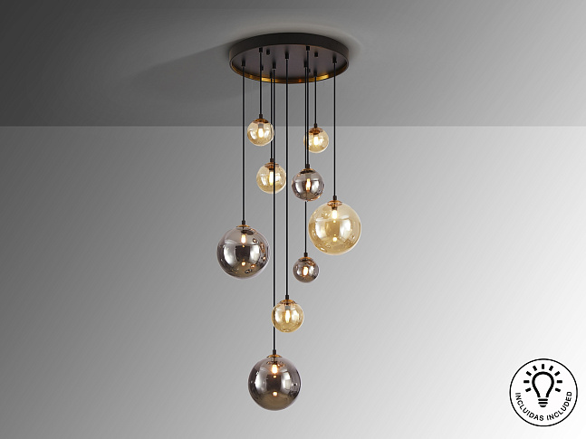 Лампа из 9 лампочек из металла, окрашенного в черный матовый цвет, с деталями из сатинированной латуни. Сферические стеклянные плафоны диаметром 10, 12 и 20 см, окрашенные в янтарный и мерцающий дымчато-серый цвета. Регулируется по длине. ·Этот товар включает в себя 9 светодиодов G9 4 Вт.