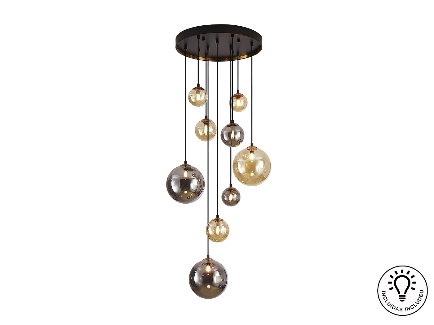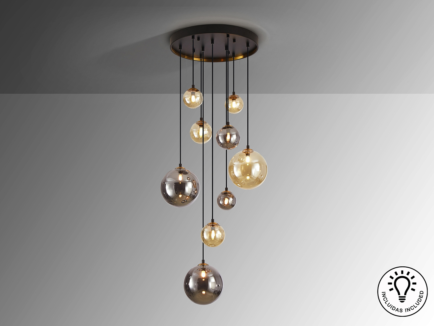 Лампа из 9 лампочек из металла, окрашенного в черный матовый цвет, с деталями из сатинированной латуни. Сферические стеклянные плафоны диаметром 10, 12 и 20 см, окрашенные в янтарный и мерцающий дымчато-серый цвета. Регулируется по длине. ·Этот товар включает в себя 9 светодиодов G9 4 Вт.