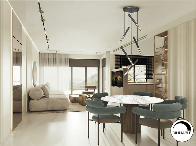 Светильник из 5 лампочек из металла с матовой черной и блестящей золотой отделкой. Опаловые акриловые рассеиватели. регулируемая высота. Светодиод мощностью 25 Вт, 2250 лм, 3000 К. С РЕГУЛИРОВКОЙ РЕГУЛИРОВКИ. · Эта лампа поставляется с ГРАВИТАЦИОННЫМИ ПЕРЕКЛЮЧАТЕЛЯМИ для улучшения крепления к потолку.