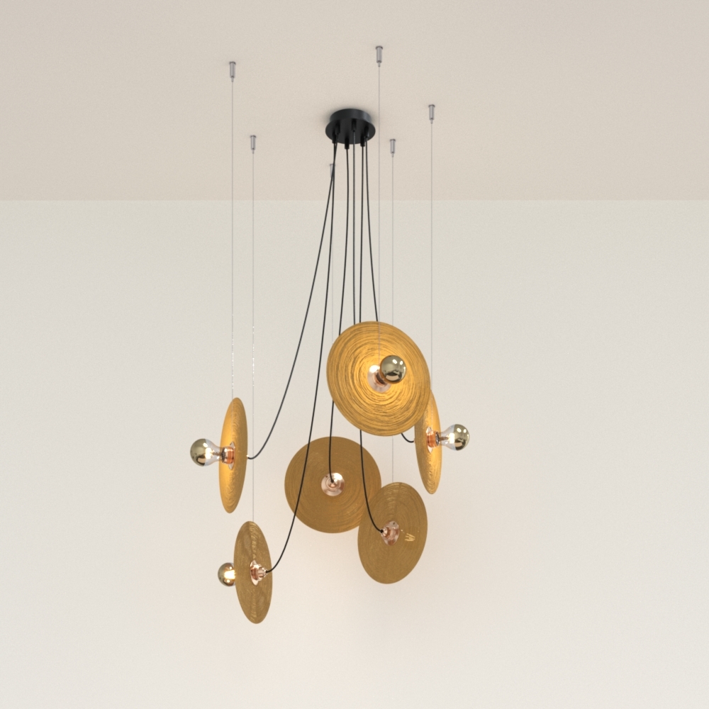 Люстра состоит из шести подвесов. Подвес представляет собой рассеиватель в виде цветного диска, металлический патрон-основание и регулируемый по длине кабель в черной пластиковой оплетке.