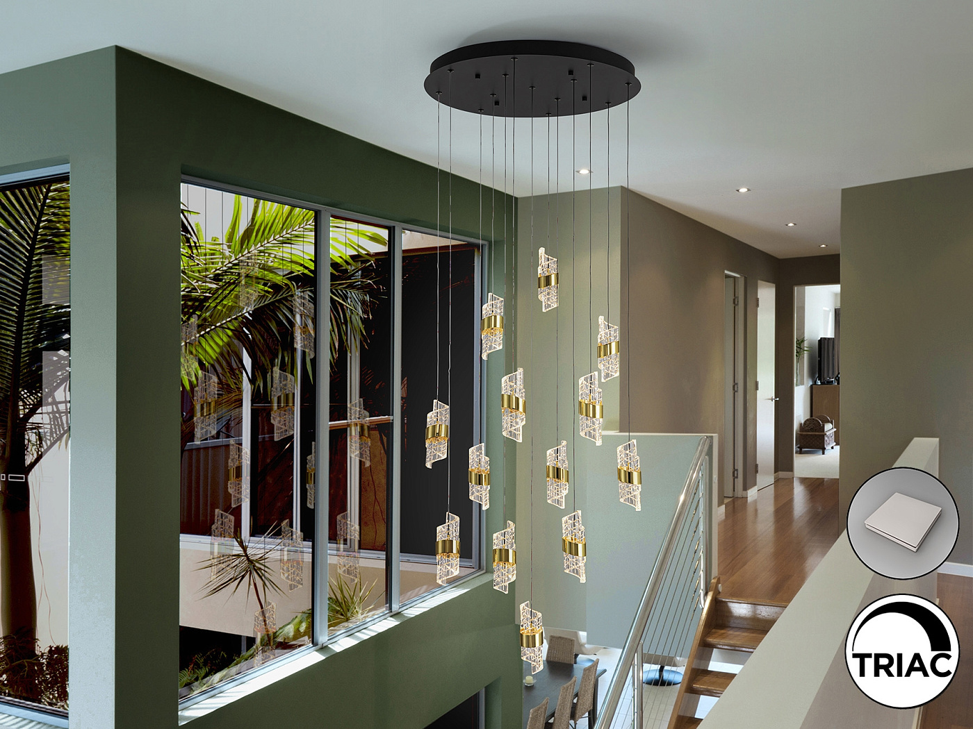 Лампа на 13 светодиодов. Изготовлена из металла с матово-черной и золотой отделкой. Абажуры со спиральным дизайном из формованного и резного акрила. Регулируется по высоте. Светодиоды мощностью 91 Вт. 8370 лм. В комплект входят драйвер TRIAC и комплект для регулировки яркости. В этом изделии используется светодиодный драйвер с симистором и регулировкой яркости 0–10 В, в комплект входит набор диммера с диммером и радиочастотным пультом дистанционного управления, или его можно регулировать с помощью симистора или настенного диммера 0–10 В. · Эта лампа поставляется с ГРАВИТАЦИОННЫМИ ПЕРЕКЛЮЧАТЕЛЯМИ для улучшения крепления к потолку.