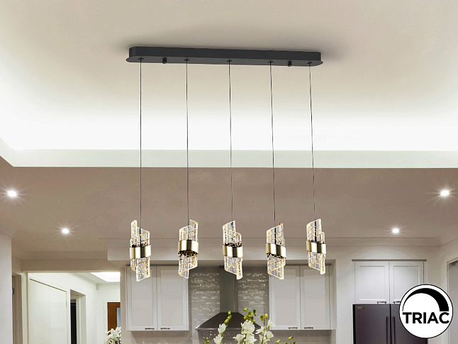 Лампа с 5 светодиодами. Изготовлена из металла с матово-черной и ярко-золотой отделкой. Абажуры со спиральным дизайном из формованного и резного акрила. Регулируемая высота. Светодиоды 35 Вт. 3220 лм. 3000 К. С РЕГУЛИРОВКОЙ ЯРКОСТИ В этом продукте используется светодиодный драйвер с симисторным типом и регулировкой яркости 0-10 В. Яркость можно регулировать с помощью настенного светодиодного диммера с этими функциями. · Эта лампа поставляется с ГРАВИТАЦИОННЫМИ ПЕРЕКЛЮЧАТЕЛЯМИ для улучшения фиксации на потолке.