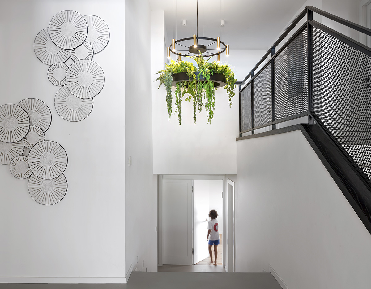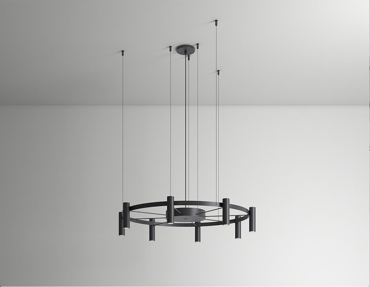 Люстра представляет собой стилизованное колесо с цилиндрическими лампами, которые могут излучать свет вверх и вниз. Laverd предлагается в двух размерах, которые можно комбинировать или соединять вертикально. Центральный элемент, подвешенный на стальных тросах, позволяет создавать различные формы.