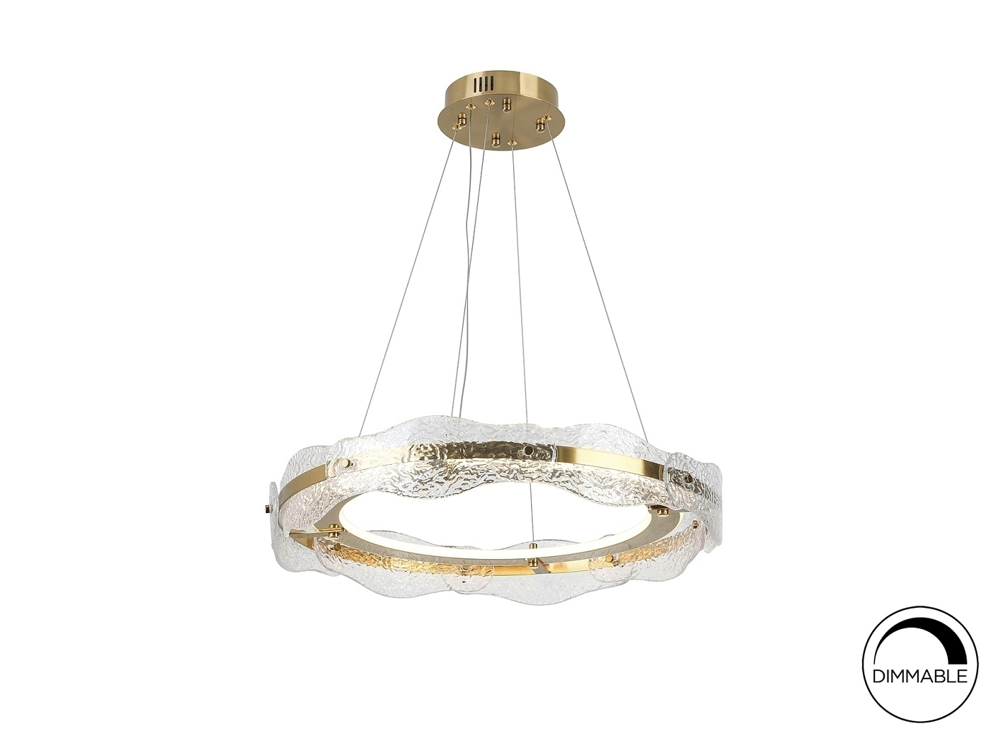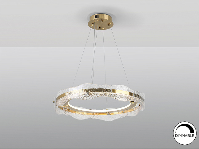 Светильник из металла и алюминия с отделкой матовым золотом. Рассеиватель из фактурных стеклянных пластин. Регулируемый по высоте. Светодиодное освещение 42Вт, 1800Лм, 3000К.