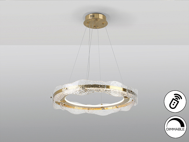 Светильник из металла и алюминия с отделкой матовым золотом. Рассеиватель из фактурных стеклянных пластин. Регулируемый по высоте. Светодиодное освещение 42Вт, 1800Лм, 3000К. DIMMABLE Этот продукт включает в себя светодиодные драйверы с диммированием 0-10 В или ШИМ, приемник и радиочастотный пульт дистанционного управления. Чтобы использовать его с настенным выключателем с диммером, используйте диммеры только этих двух типов. Любой другой тип диммирования может повредить светодиодный драйвер.