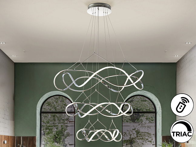 3-х этажный светодиодный светильник из алюминия, хромированная отделка. Опаловые силиконовые рассеиватели. Регулируемая высота. 30 Вт+45 Вт+63 Вт, 12420 лм. 3000 К. С РЕГУЛИРОВКОЙ. Драйвер TRIAC и НАБОР DIMMING SET включены. Этот продукт включает в себя светодиодные драйверы с триаком и регулировкой яркости 0–10 В. В комплект входит комплект затемнения с приемником и радиочастотным пультом дистанционного управления. Его также можно использовать с симисторным или настенным диммером 0–10 В. · Эта лампа поставляется с ГРАВИТАЦИОННЫМИ ПЕРЕКЛЮЧАТЕЛЯМИ для улучшения крепления к потолку.