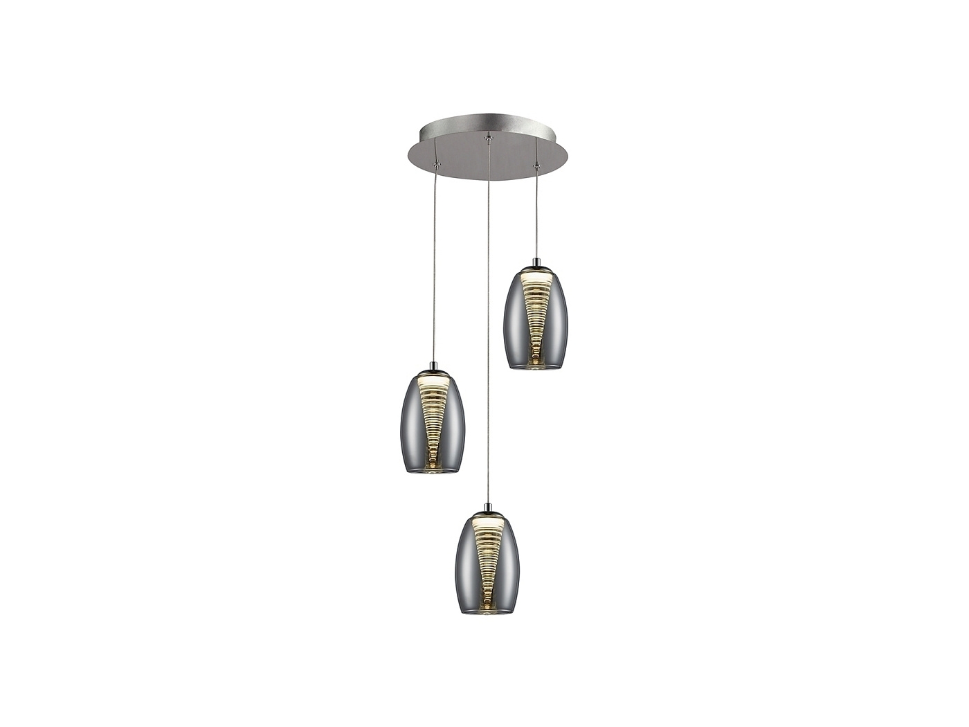 Подвесной светильник с 3 лампами LED, из металла с покрытием "хром". Двойной абажур: внешний - из зеркального стекла, внутренний - из прозрачного поликарбоната в форме конуса, с регулируемой высотой, 3 х 5W LED, 3000 K.
